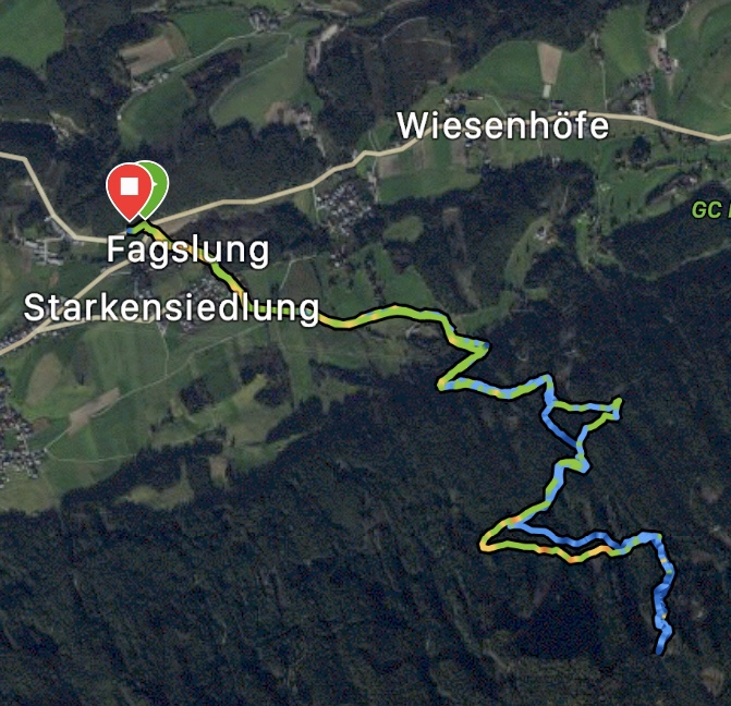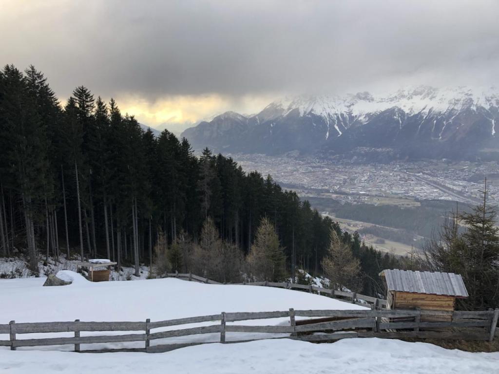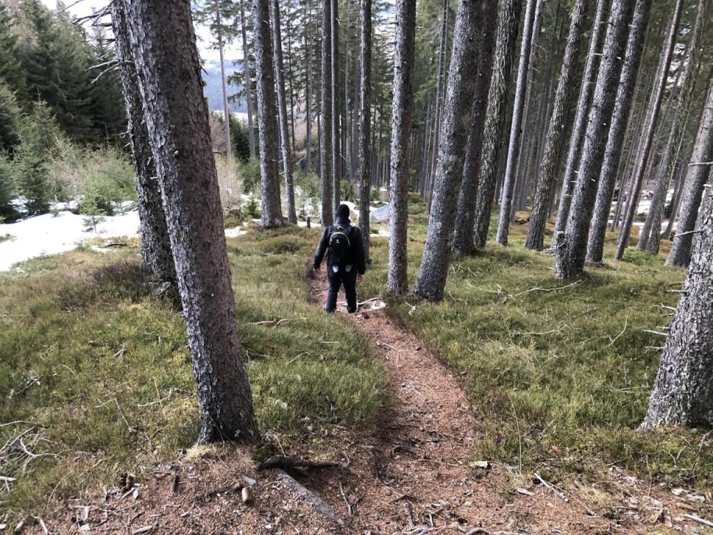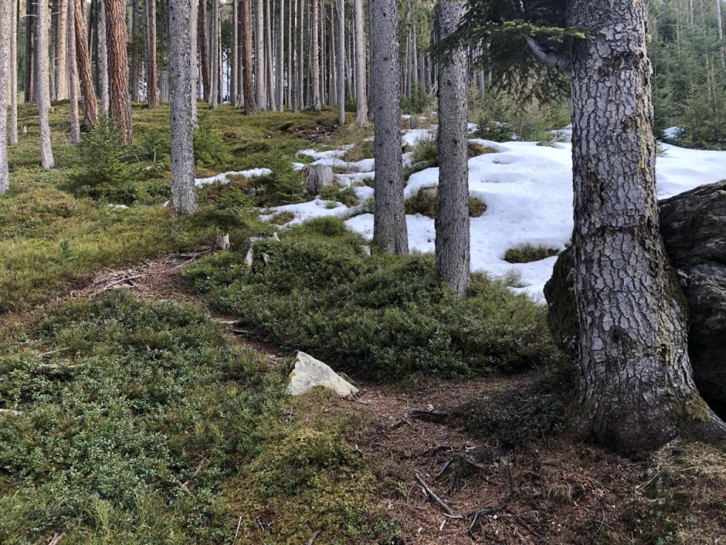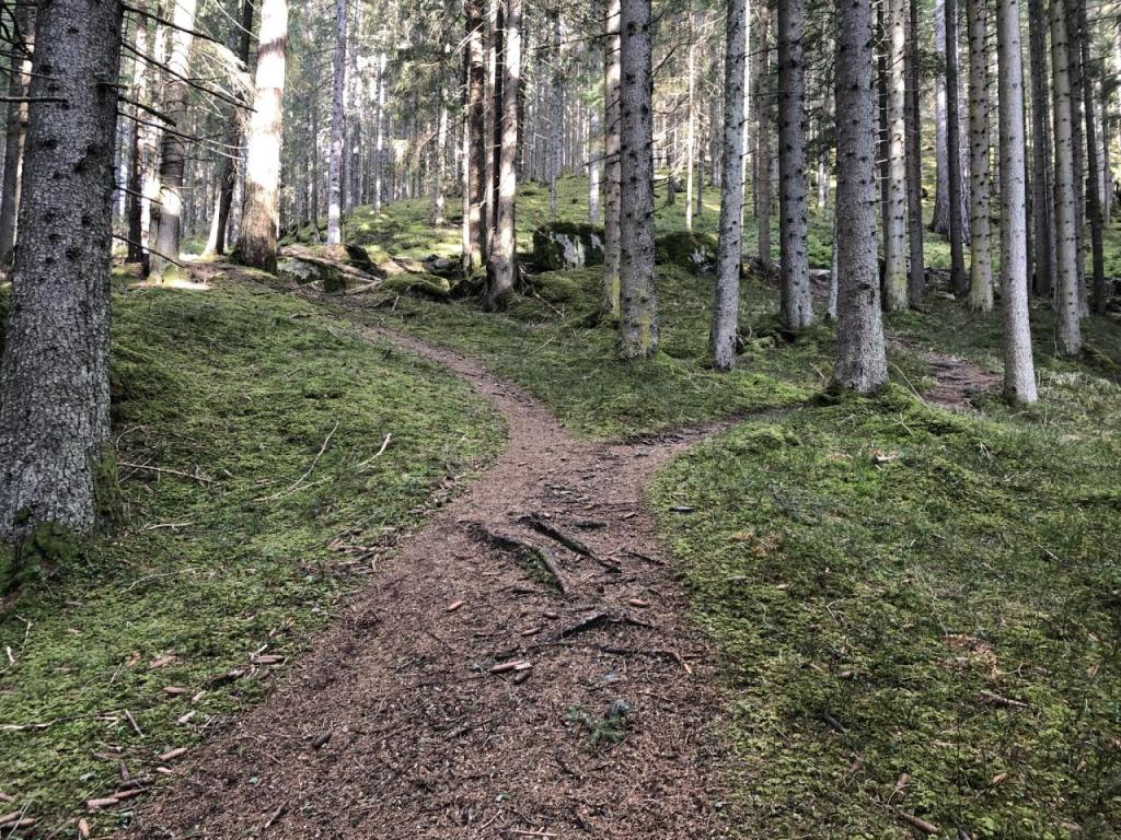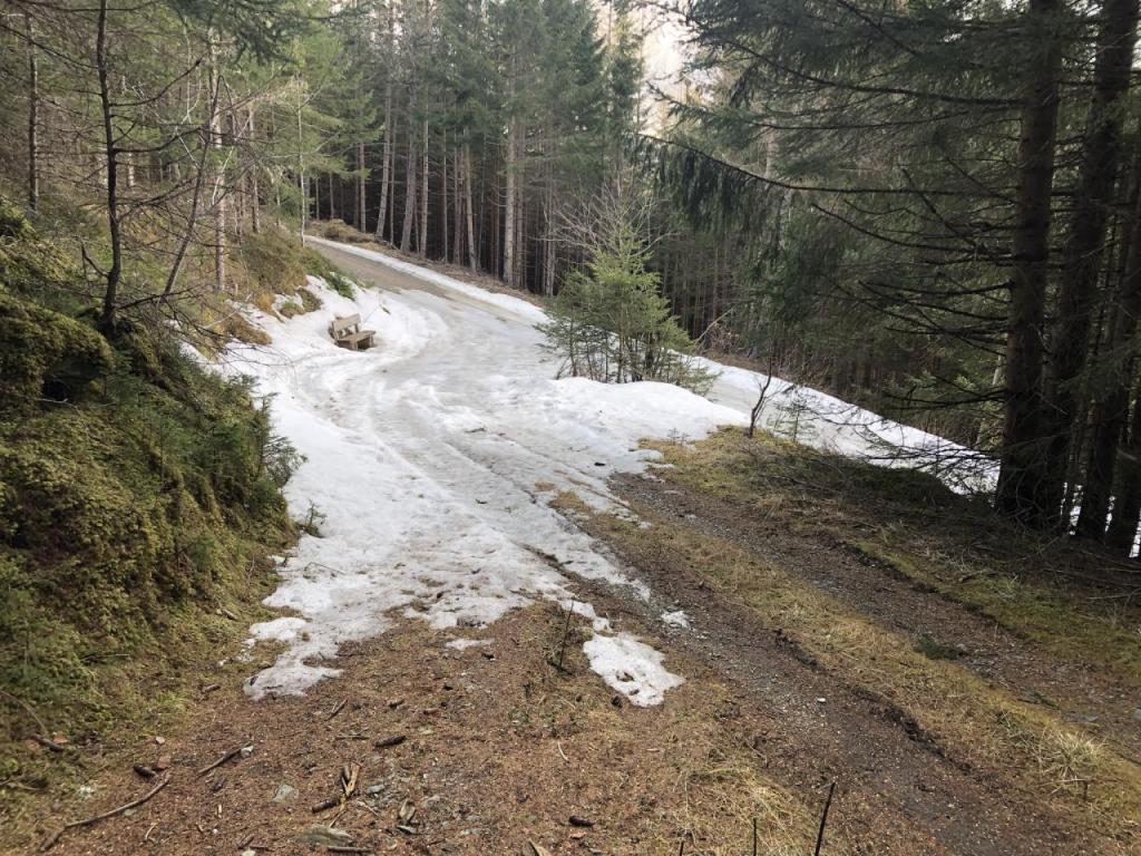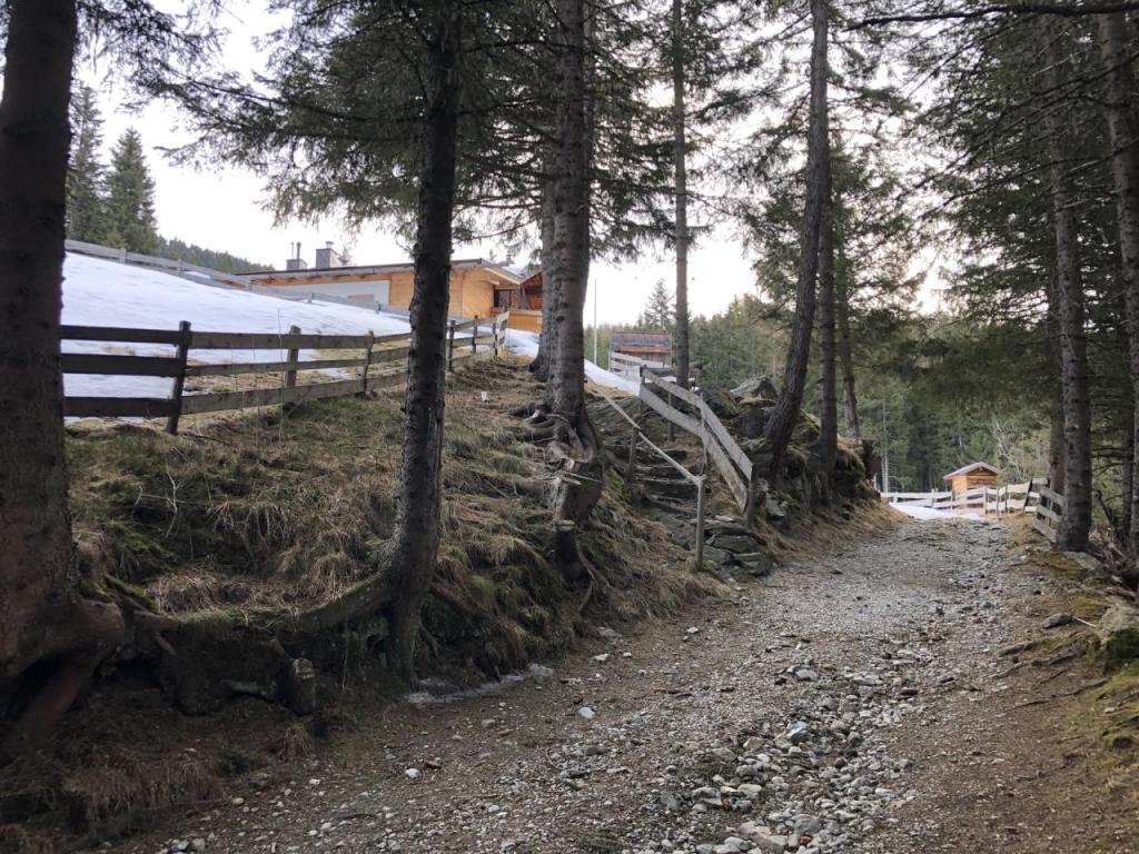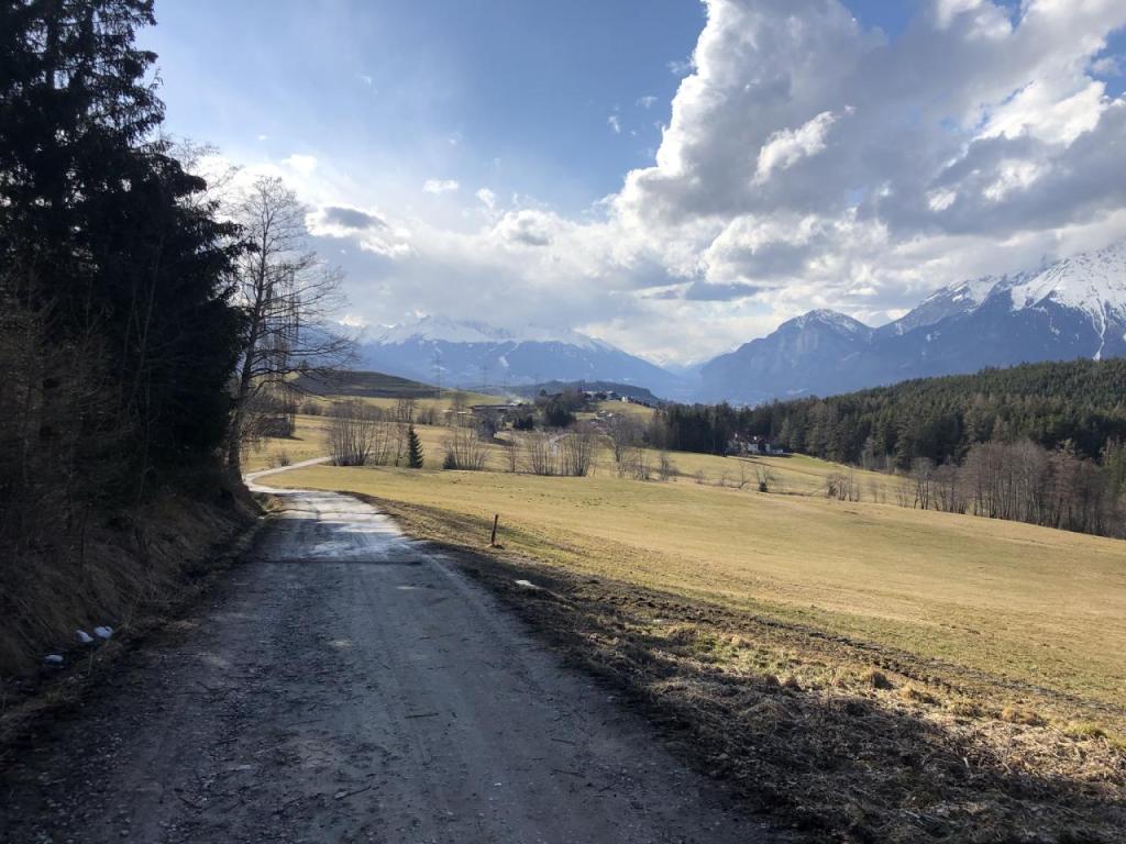 Wir starten in Fagslung, einem kleinen Weiler von Aldrans. Von hier müssen wir erst ein Stück mit dem Forstweg vorlieb nehmen, bis wir den eigentlich Steig erreichen. Dieser führt dann, immer wieder die Forststraße kreuzend, relativ direkt Richtung Alm.