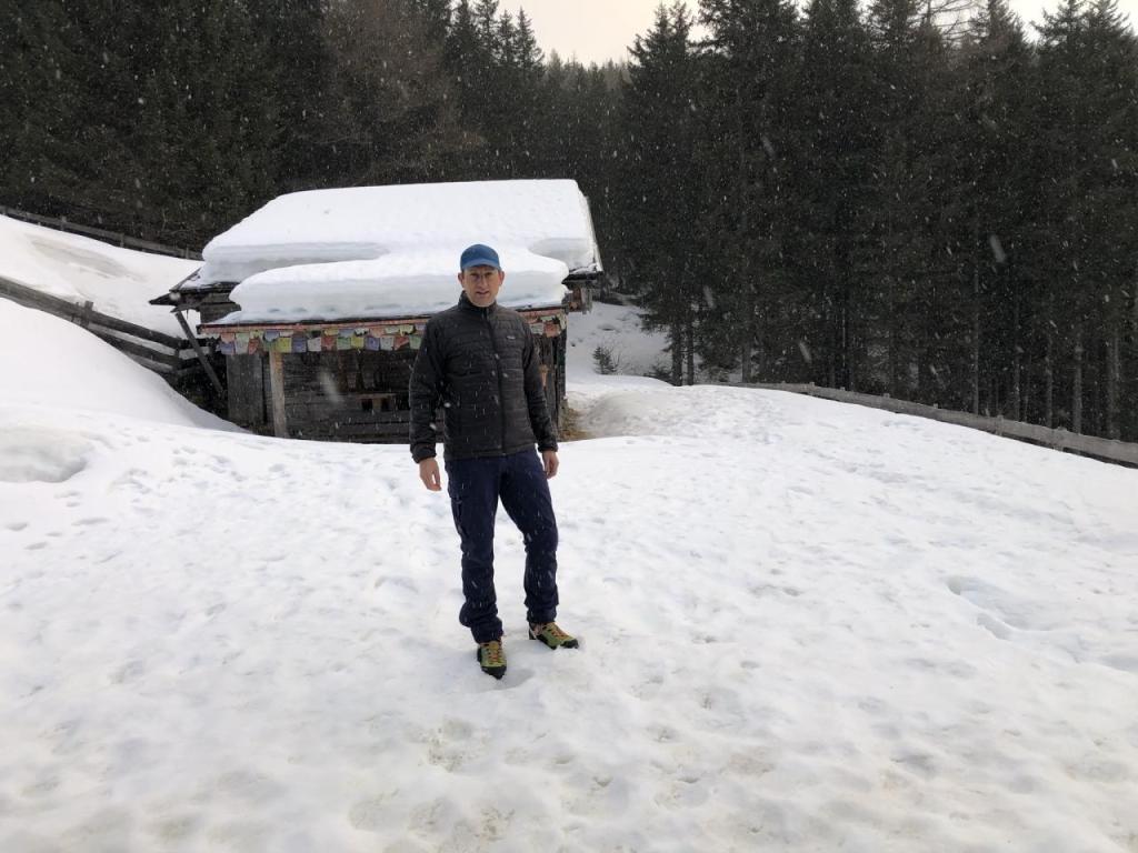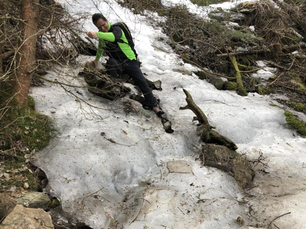Im oberen Drittel der Wanderung müssen wir uns mit Schnee und Eis herumschlagen, eine Stelle, ein vereister Bach, erfordert höchste Konzentration…