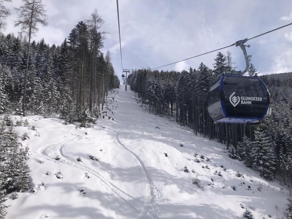 Ein kurzes, letztes Aufbäumen des Winters bringt nochmals schönsten Pulver in unsere Lande. Da bietet sich ein Ausflug auf den Schartenkogel, direkt nach der Arbeit an. Mit dem Postbus fahre ich direkt von zu Hause (ohne Umsteigen) zum Skigebiet, mit der Gondel hinauf zur Mittelstation.