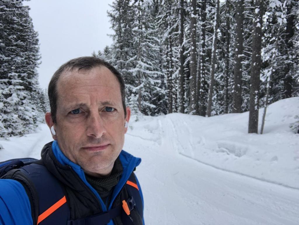 Die letzten Ski- und Snowboardfahrer rauschen die Piste hinunter, während ich mich leicht bekleidet die alte Pistentrasse hoch quäle.