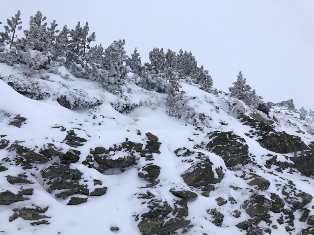 War das Wetter bis hier noch in Ordnung, ist nun eine Kombination aus Dämmerung, Wolken und Schneefall eingetreten. Die Sicht ist schlecht, teilweise kann die Aufstiegsspur nicht gesehen werden.