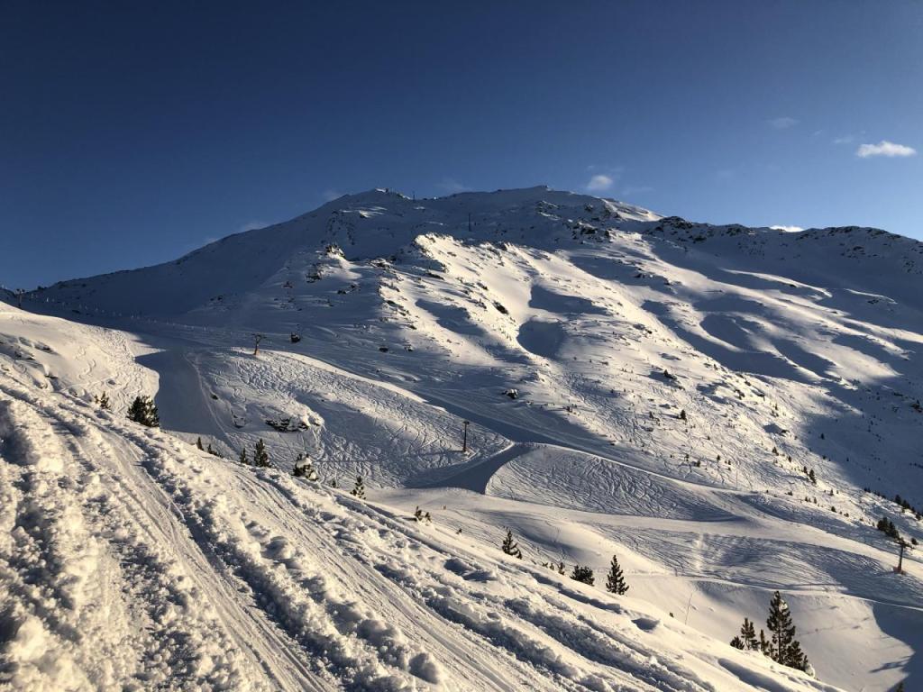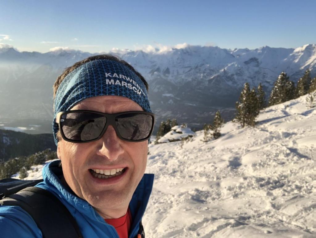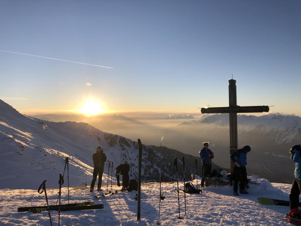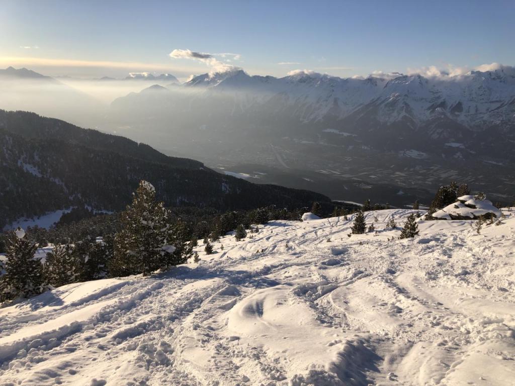 Die Aussicht vom Rücken auf das Skigebiet und besonders auf das Glungezermassiv ist beeindruckend. Die die Abendsonne tut den Rest dazu.