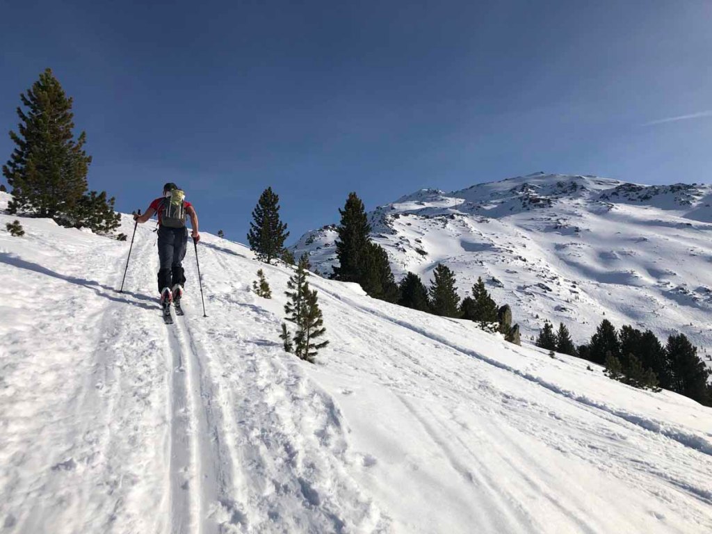 Im oberen Teil der „Pistentour“ kürzen wir ein wenig über Gelände ab. Vor uns, als mächtiger Block, ergebt sich das Glungezermassiv.