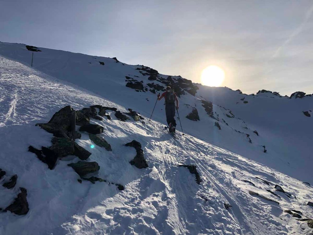 Den unteren Teil bestreiten wir im Skigebiet, einmal kürzen wir noch über eine weitere Buckelpiste ab. Die Sonne steht nun tief und zaubert warme Farben auf die bestens präparierte Pisten.