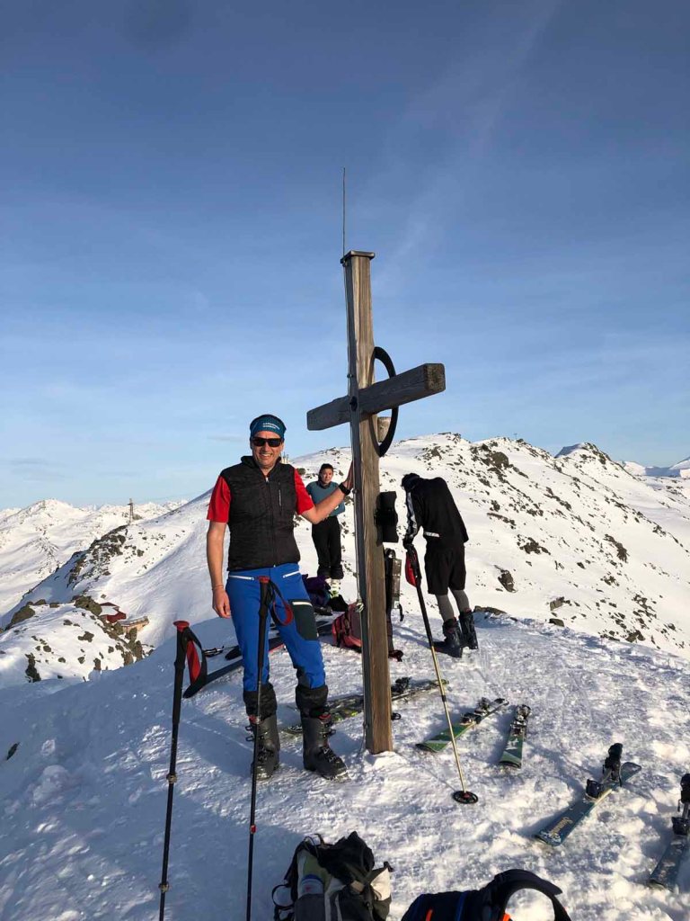Dann stehen wir auf dem höchsten Punkt der Tour, der Sonnenspitze (2.639m). Die Aussicht ist phänomenal, es ist fast windstill auf dem Gipfel und die Sonne lacht noch schwach vom Himmel.