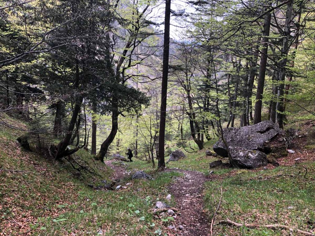 Heute marschieren wir gleich weiter, ein kurzes Stück wandern wir noch auf der Forststraße, bis wir über ebendiese die Einmündung in die Salzstraße erreichen. Hier drehen wir um, um nun auf der Asphaltstraße wieder hinab ins Tal zu gehen.