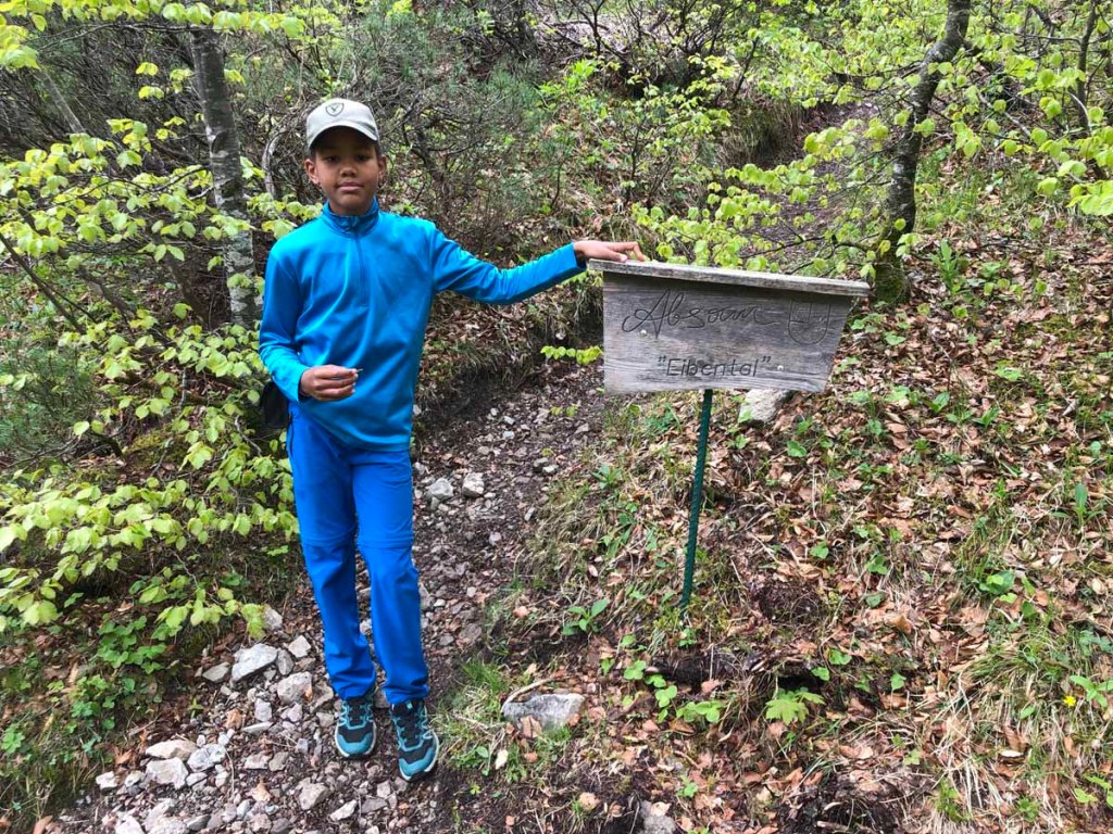 Am Rückweg kommen wir wieder an unserem Aufstiegspfad zurück, ein Wegweiser zeigt hier das Eibental an.