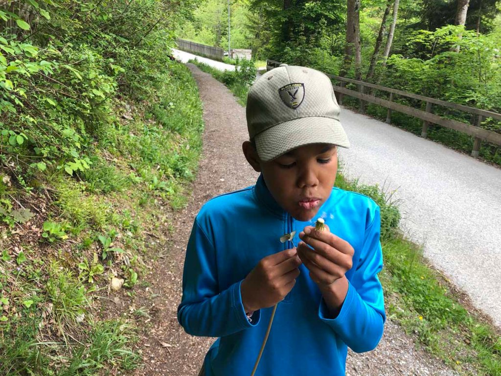 Kurz vor dem Parkplatz entdeckt Letu ein paar verblühte Löwenzahn, oder auch Pusteblumen, die er freudestrahlend in alle Windrichtungen bläst. Da wird nächstes Jahr der Löwenzahn wohl wieder gut wachsen…