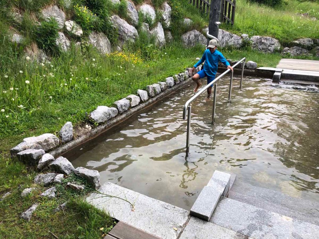 Das Kneippbecken am Hackl ist wieder eröffnet. Ich bezweifle allerdings, ob viele Lebewesen abgesehen von den schockgefrorenen Regenwürmern dieses Angebot heuer schon genutzt haben. Letu und ich wagen ein „Tänzchen“, nach einer Runde sind die Beine gefühllos, die zweite Runde ist dann schon fast eine Zumutung. Dafür ist die Wärme im Anschluss an das Kneippen sehr angenehm.