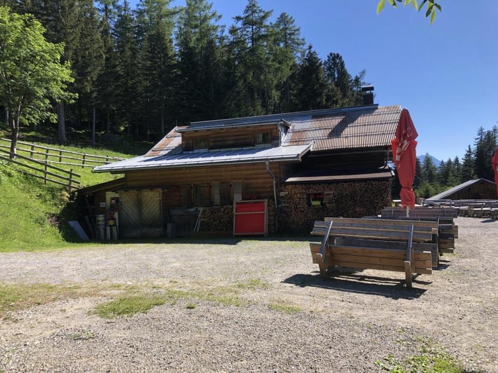 Nach 38 Minuten treffe ich oben auf der heute geschlossenen Alm einen Innsbrucker, mit dem ich ein sehr feines Gespräch führe… rasch vergeht die viel zu gemütliche Zeit hier oben. Eine feine Tour bei bestem Wetter.