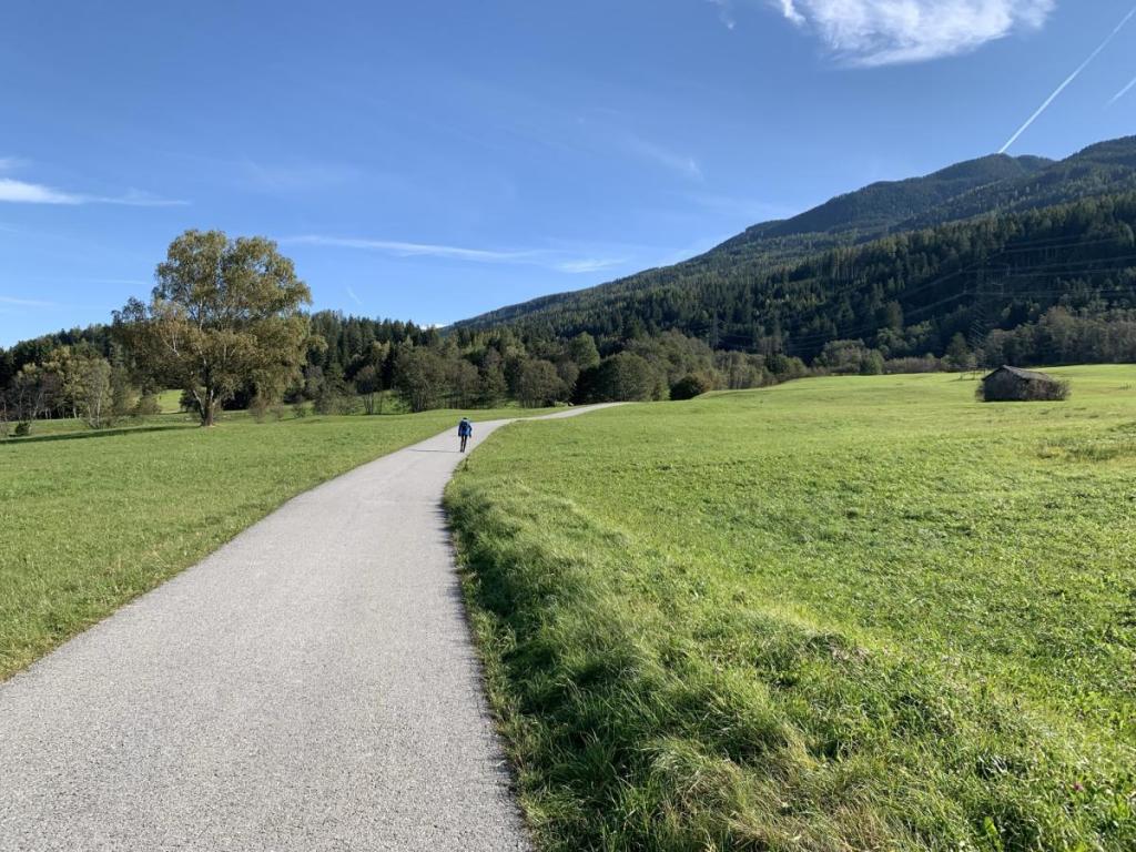 Das Wetter ist ein Traum, dennoch treffe ich fast niemanden auf meinem Weg. Einzig eine ältere Frau ist, allerdings per Pedes, auf dem Weg zur Alm.