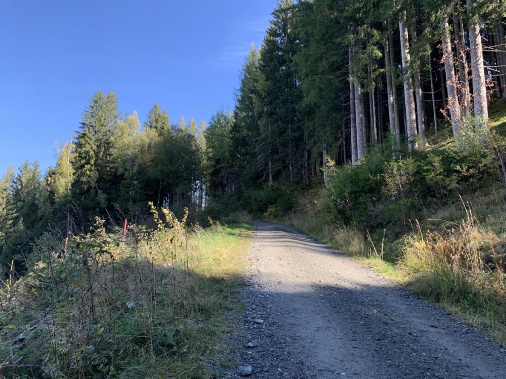 Die Forststraße zieht in gleichbleibender Steigung angenehm in die Höhe, der Weg ist allerdings mitgenommen, daran Schuld sind wohl einige Holzfuhrarbeiten mit schwerem Gerät.