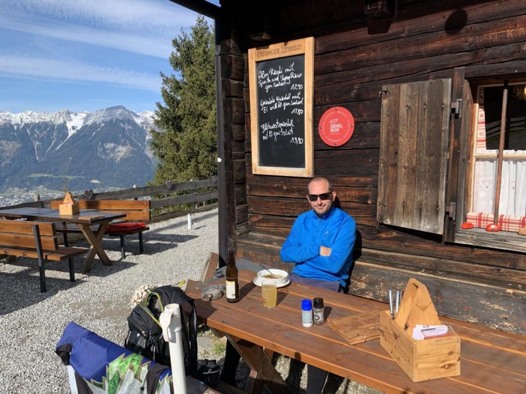 Schließlich erreiche ich die geöffnete Alm, ich bin der einzige Gast. Das ist selten, dennoch werde ich freudig begrüßt. Ein Radler und eine Kaspressknödelsuppe belohnen mich für den Aufstieg.