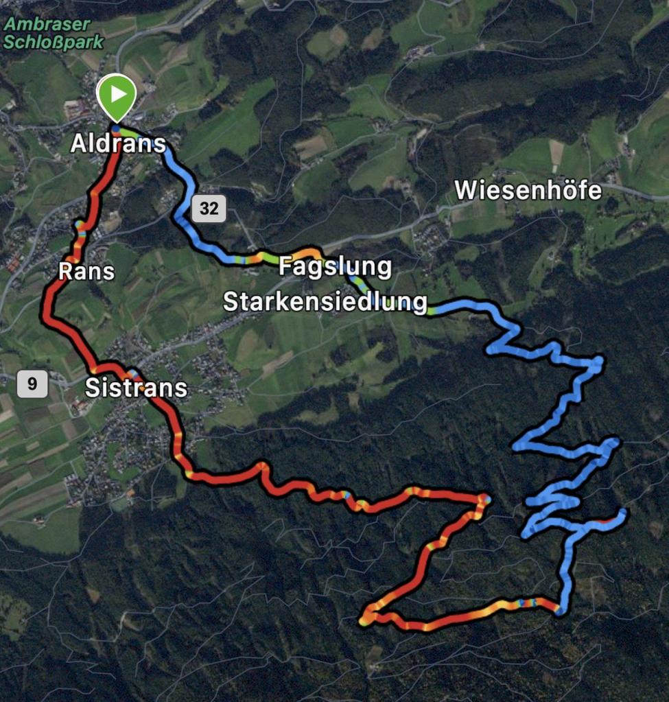 Bei Fagslung, einem Ortsteil von Aldrans, biege ich auf den Almenweg ab und nun steht dem Vergnügen nichts mehr im Wege.