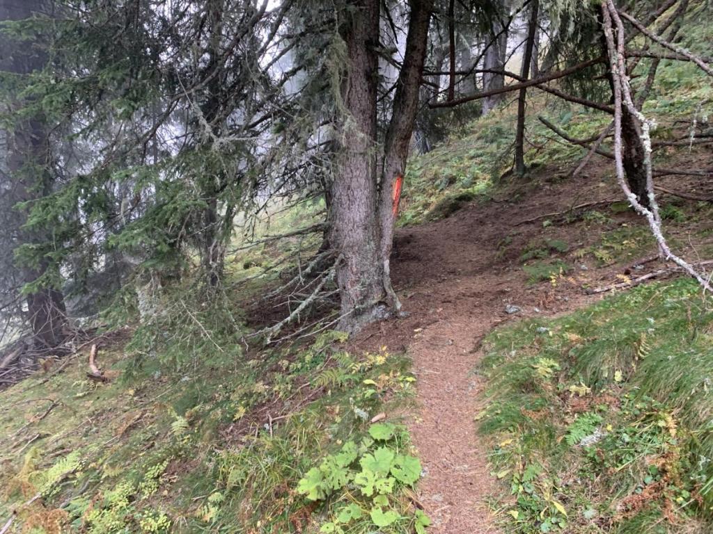Von der Station müssen wir erst die Skipiste queren, dann erreichen wir den Perlstainsteig.