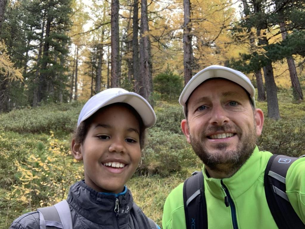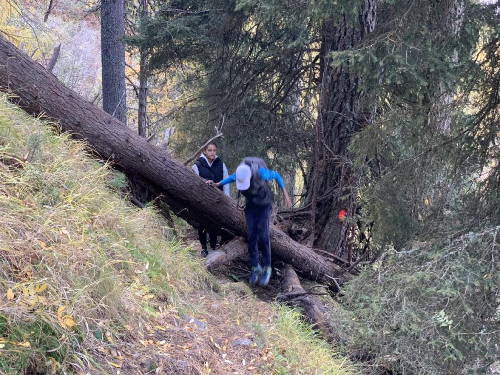 Von der Rinner Alm steigen wir auf der, im Winter als Rodelbahn präparierten, Forststraße hinab ins Tal. Ein kurzer Stopp am Spielplatz darf für Letu nicht fehlen, während sich Sara in der Sonne aalt.