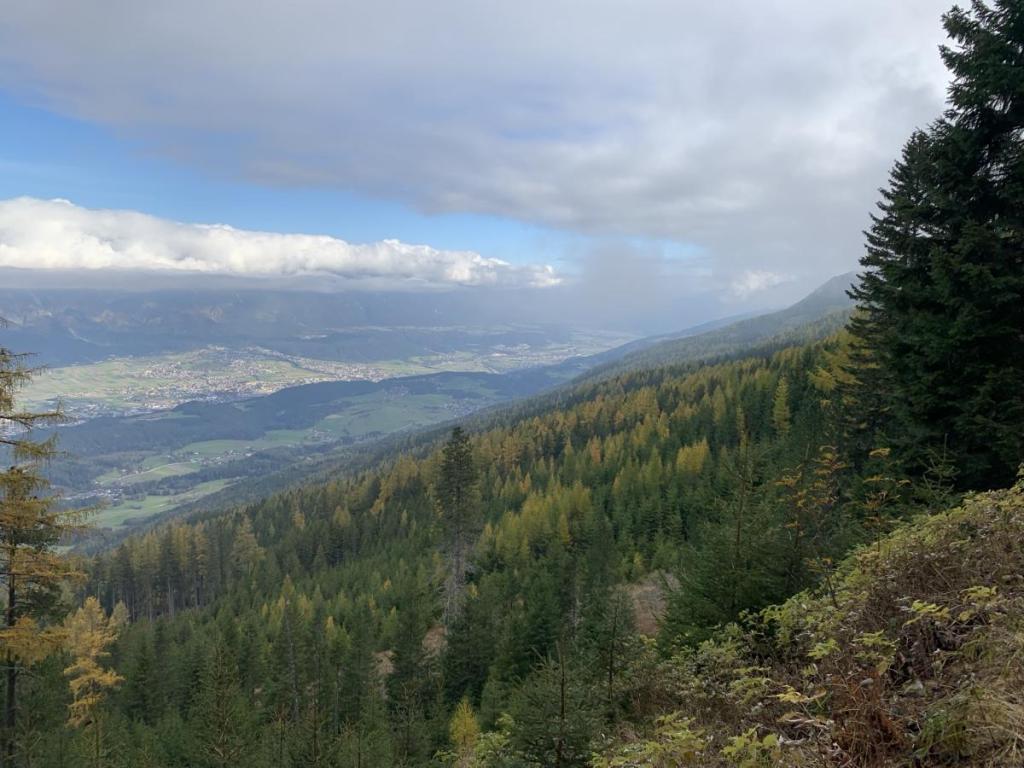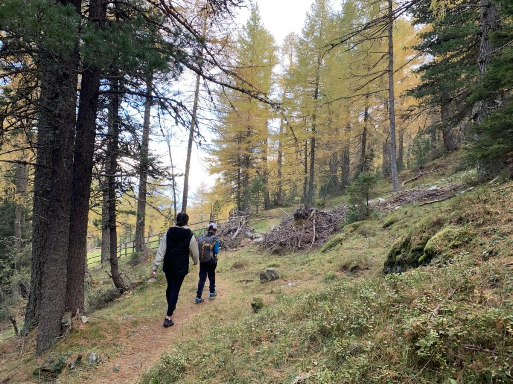 Wieder einmal öffnet sich die Aussicht ins Unterland, dort sind doch noch einige Wolken zu sehen. Und die Lärchen, die sich nun rasant ins Gelbliche verfärben, stechen auch gleich ins Auge.