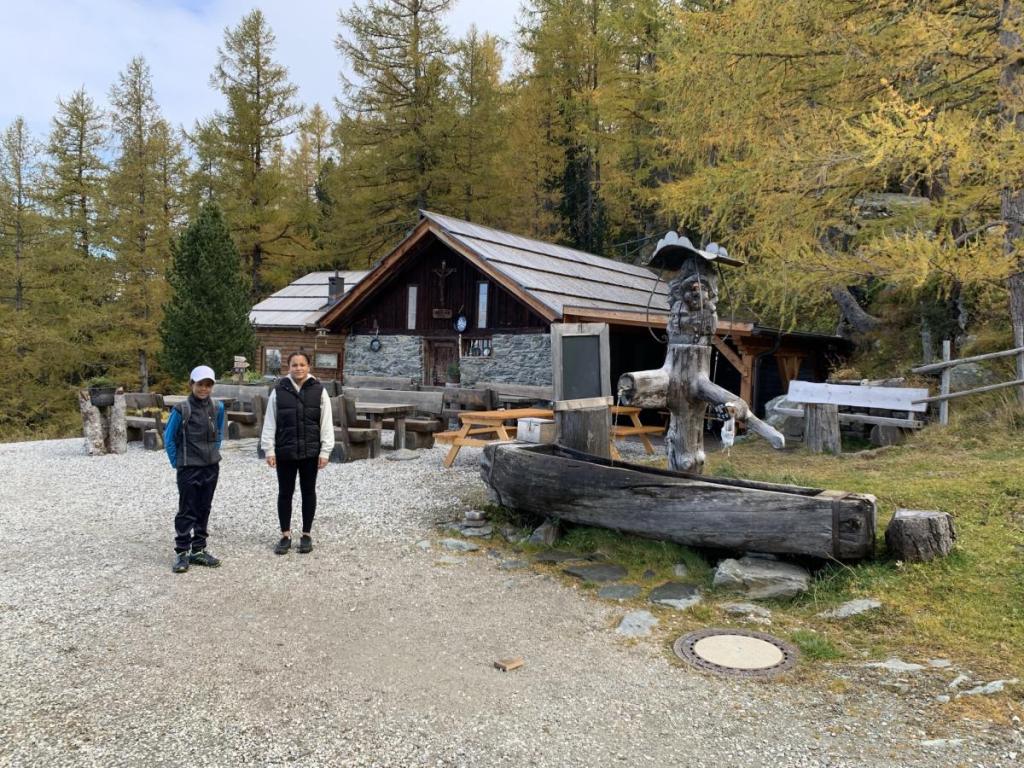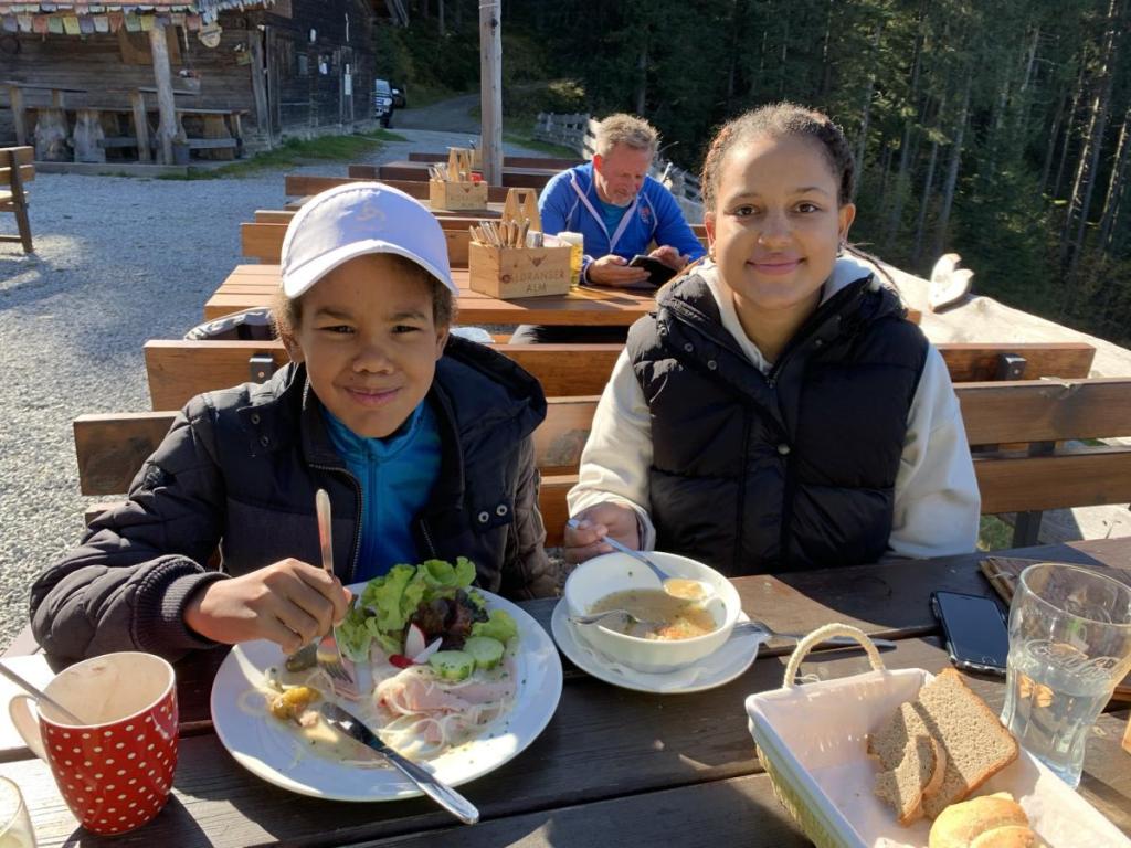 Die Sonne lacht auf die Terrasse, wir finden einen schönen Platz und gönnen uns was Gutes. Die Kinder gönnen sich eine Kaspressknödel-Suppe, während ich mir eine Saure Wurst einverleibe. Natürlich will jeder vom Anderen kosten…