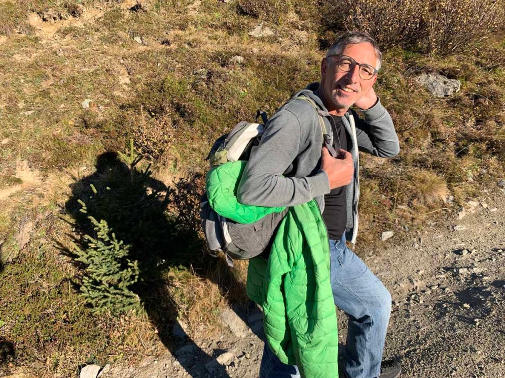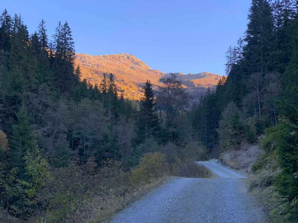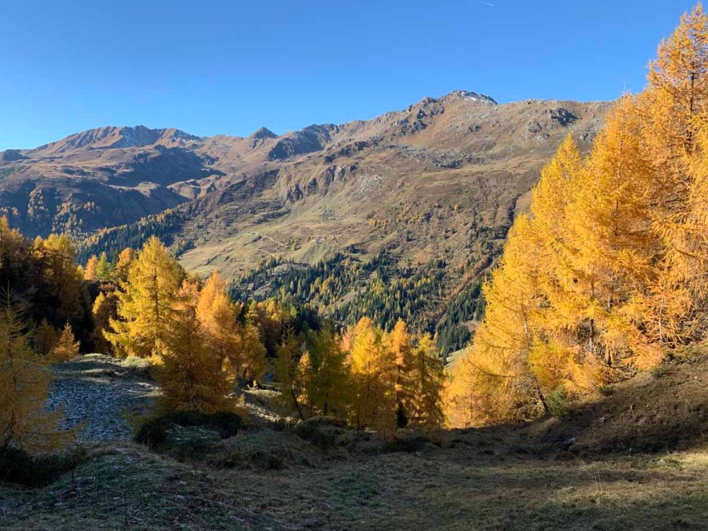 Die Sonne ist im Sinken begriffen, nun modellieren sich die Lärchen in geradezu aufdringlichem Gelb aus den in langen Schatten versinkenden Hängen.
