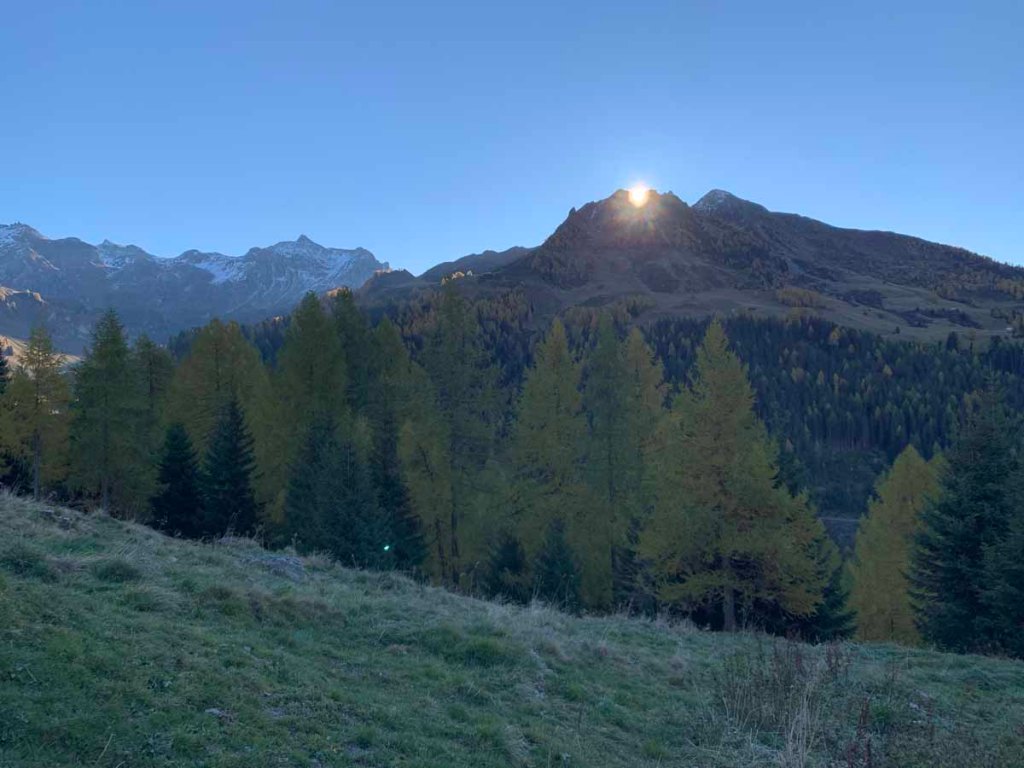 Kurz nach der Alm steigt die Sonne über den Bergkamm empor und schickt uns erste wärmende Strahlen.