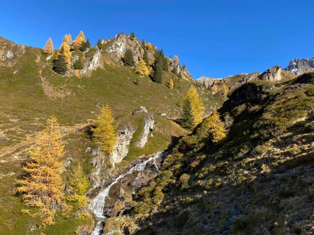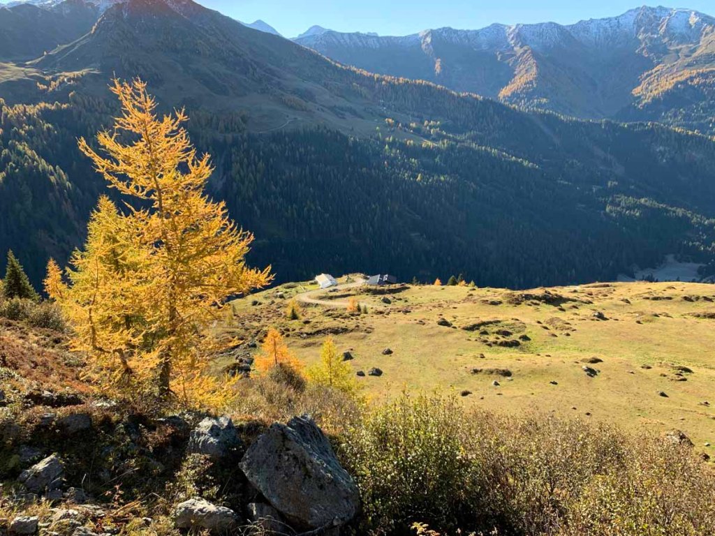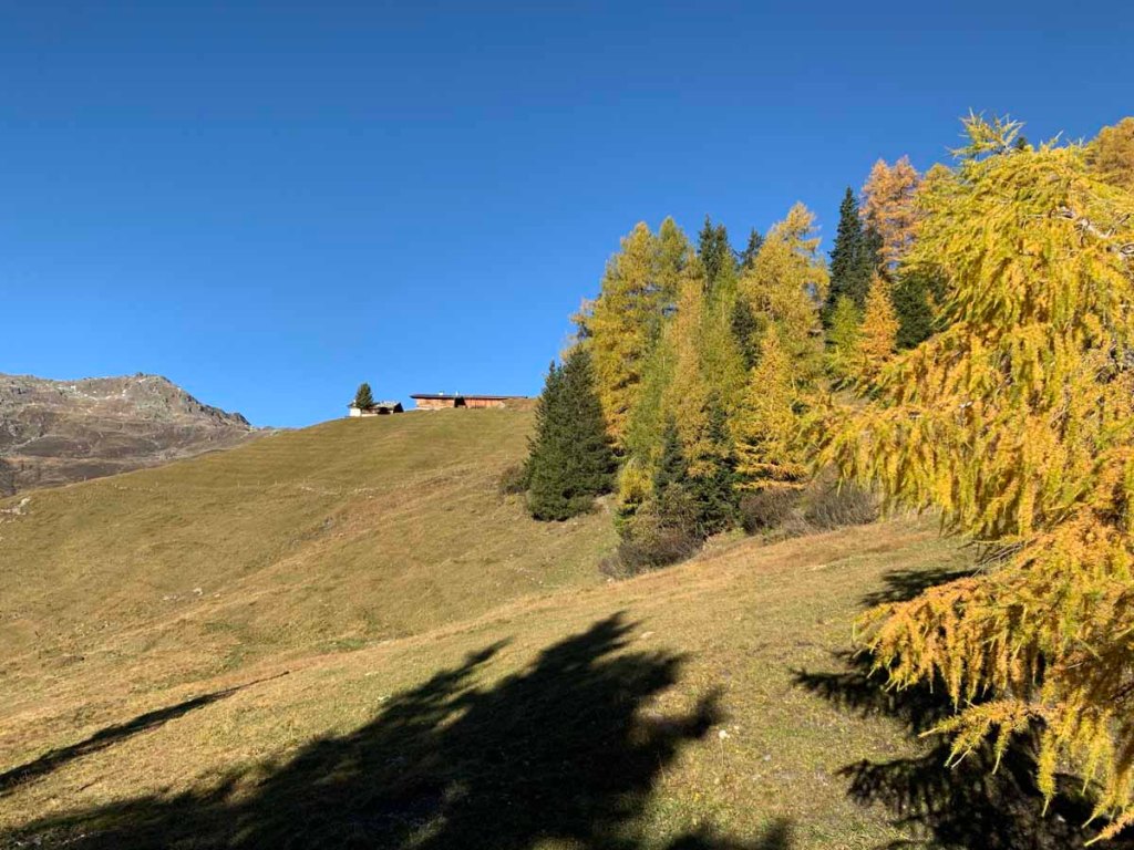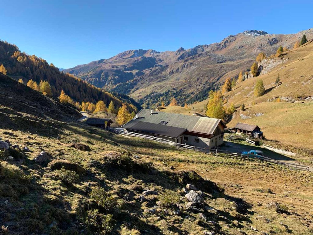 Wir ziehen weiter, nun immer durch leuchtende Lärchenwälder, bis wir die nächste Alm, die auch schon geschlossene Poltenalm (1.880m) erreichen.