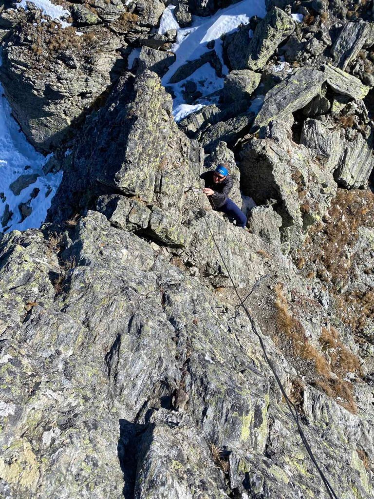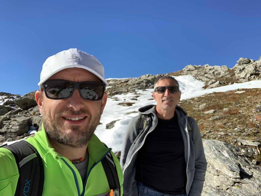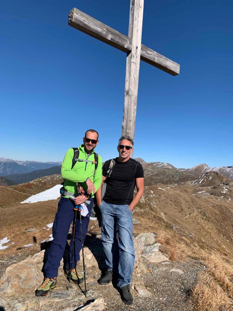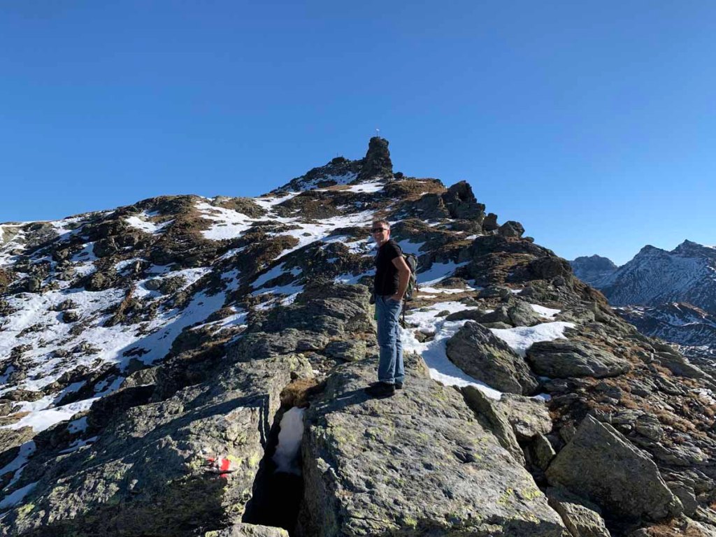 Dennoch stehen wir abwechseln auf dem Gipfel, damit wir schöne Fotos machen können. Platz zum Brotzeiten ist auf dem Gipfel eh nicht, feiner ist das am leichteren Gipfel in einer windgeschützten Kuhle.