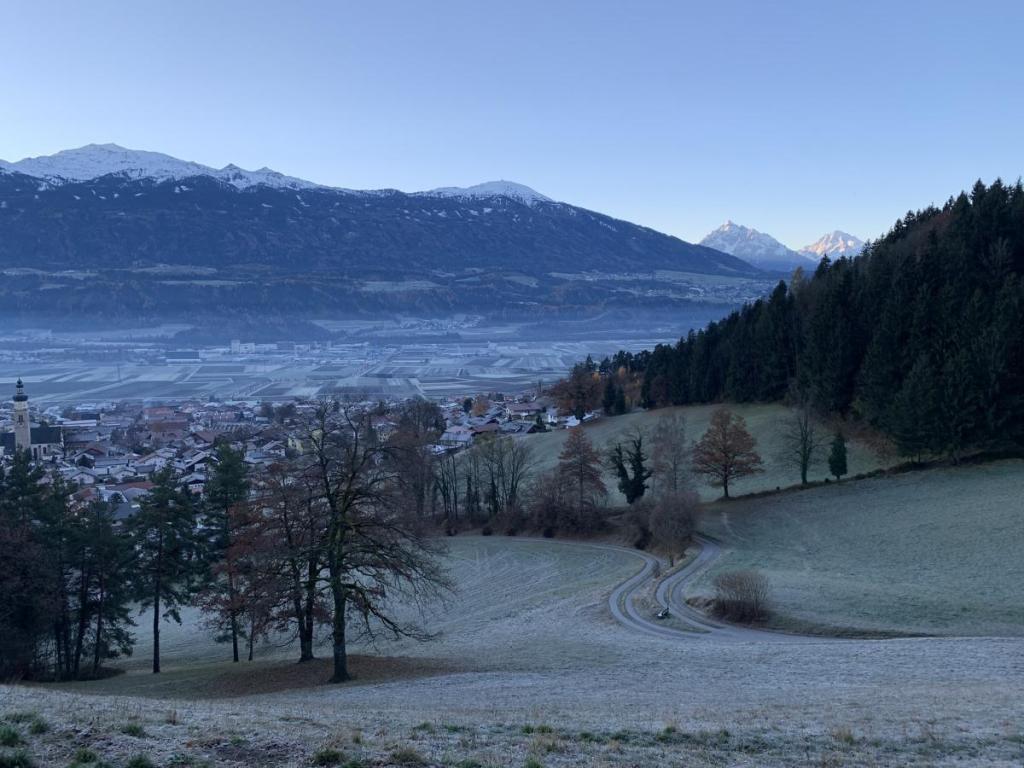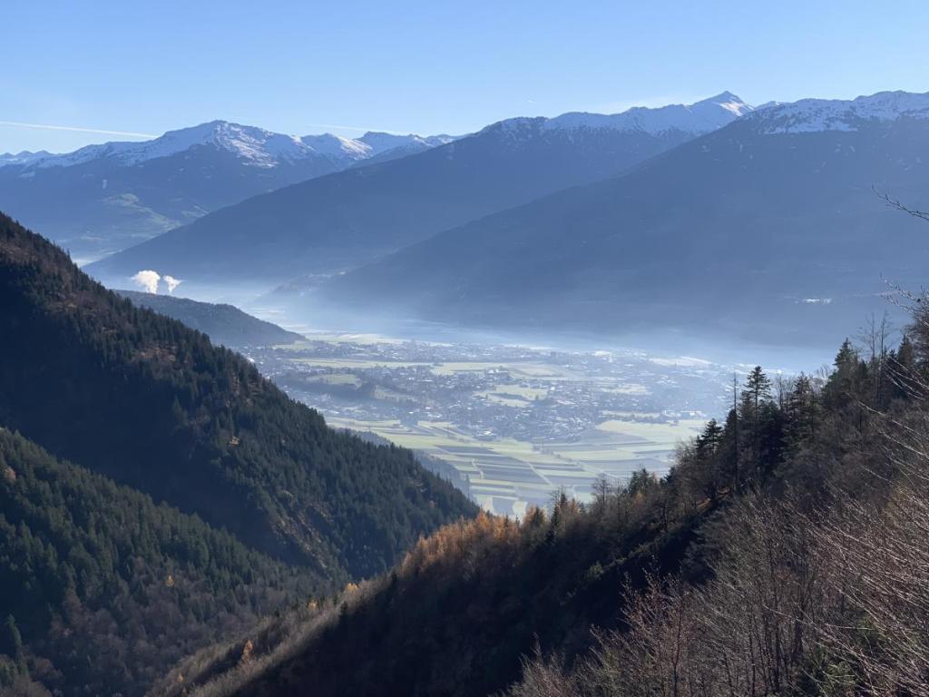 Der Blick ins Inntal, leicht dunstig, offenbart den anrückenden Winter. Die Nordhänge können sich nicht mehr vom weißen Kleid befreien, an den Südhängen ist es aber noch angenehm.