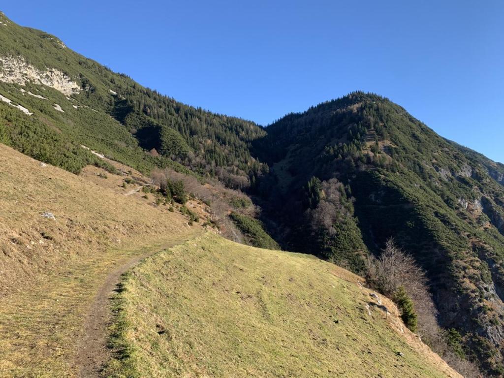 Die Gämsen ziehen um diese Jahreszeit in tiefere Gefilde, immer wieder kann ich diese begnadeten Kletterer am Wege beobachten. Ich versuche, möglichst leise vorbei zu schleichen, damit der schon angefressene Winterspeck nicht unnötig reduziert wird.