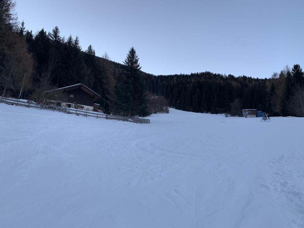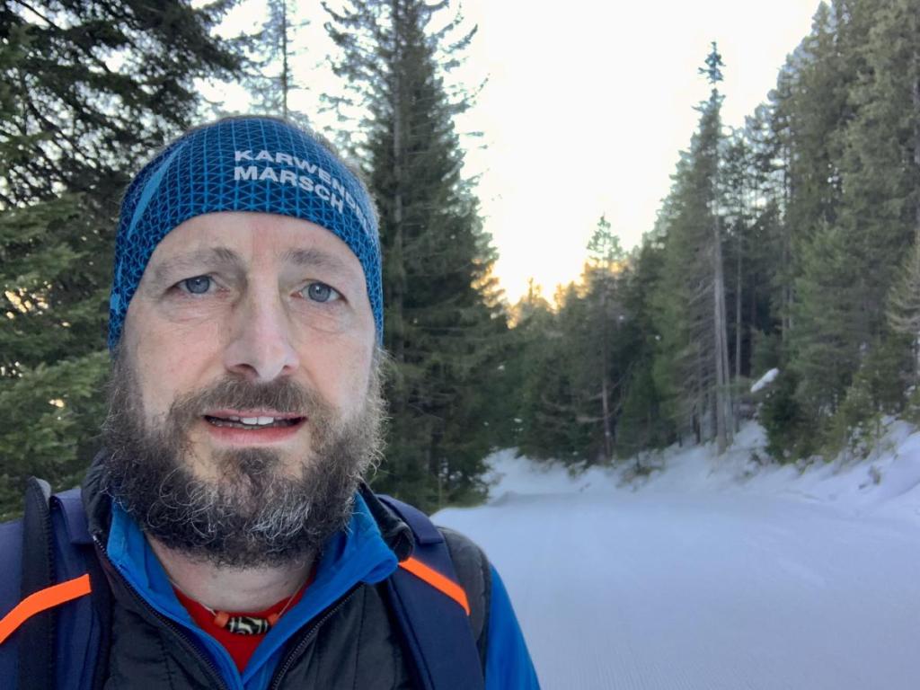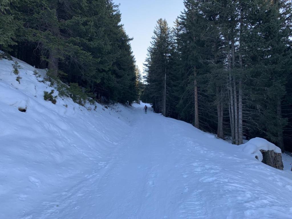 Ich bin einem Skitourengeher gefolgt, der einen Ziehweg zur Patscher Alm genommen hat. Es ist ein kleiner, aber feiner Umweg, der ruhig durch den Wald führt.
