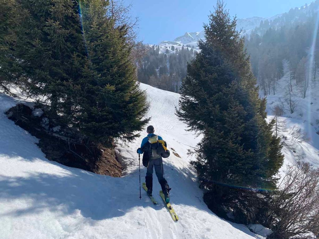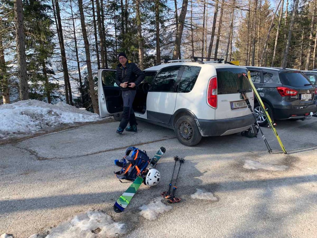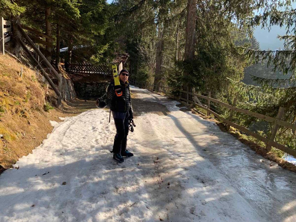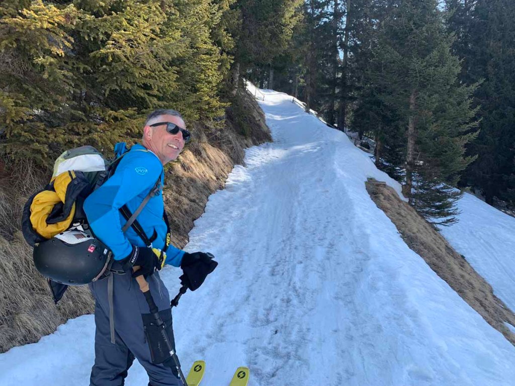 Die Schneelage ist hier nicht üppig, daher müssen wir die Ski die ersten paar Meter tragen…