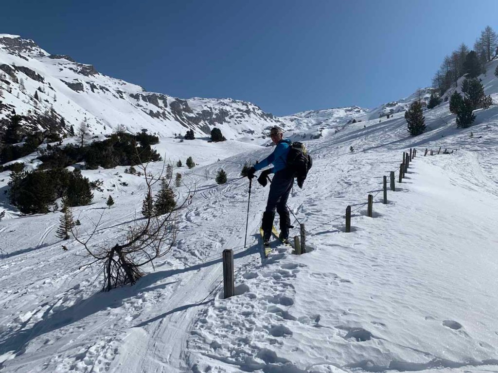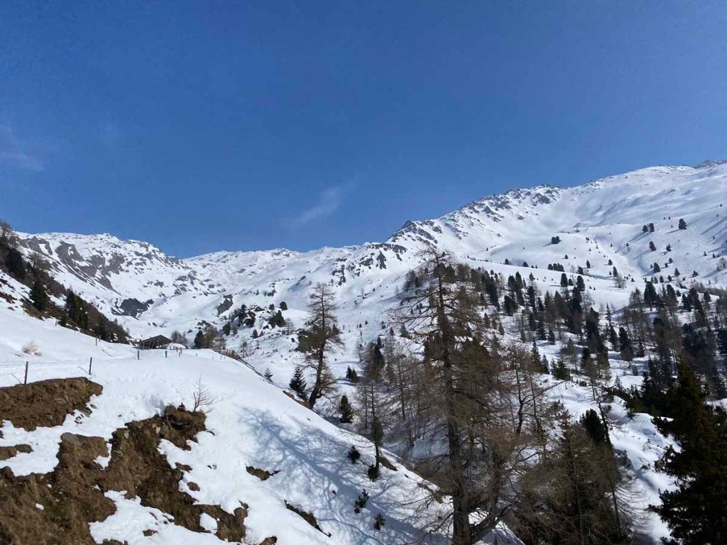 Vorbei an der Arztaler Hütte, mit vielen Spuren im Schnee, erreichen wir die Ebene, ,die zum Arztaler Niederleger führt.