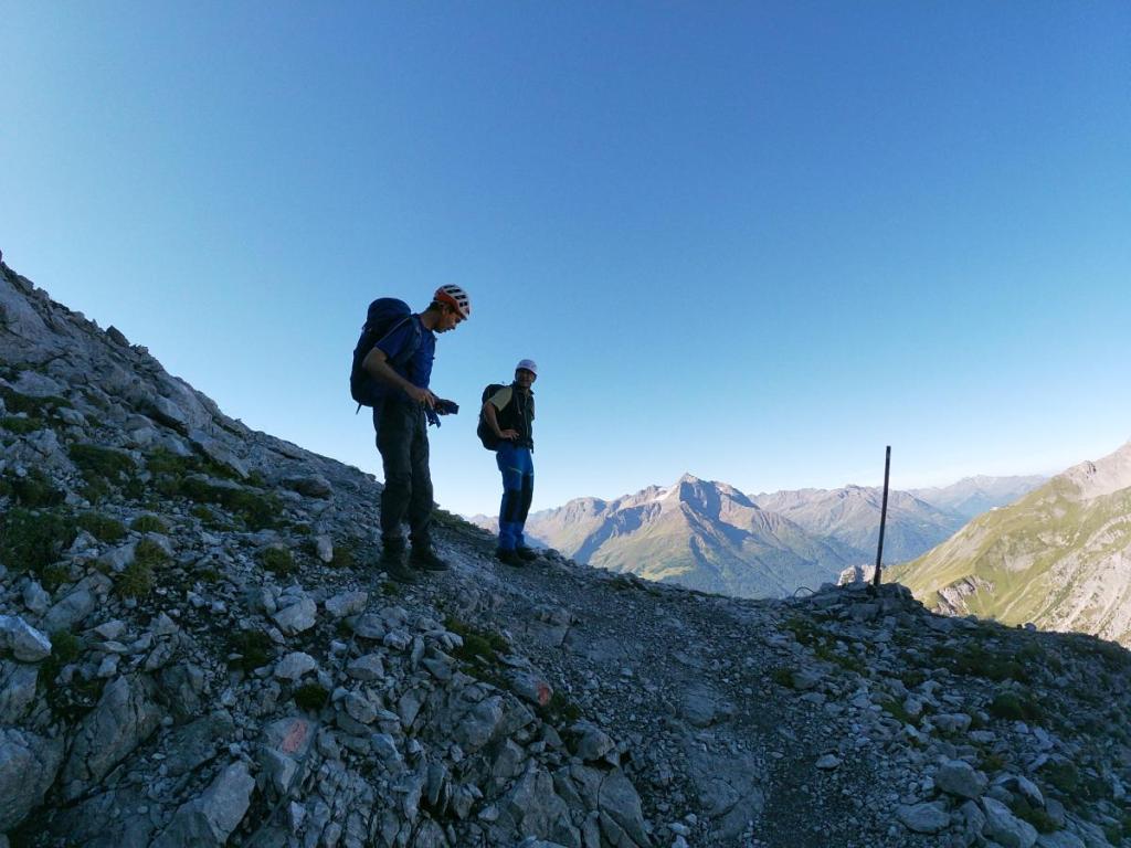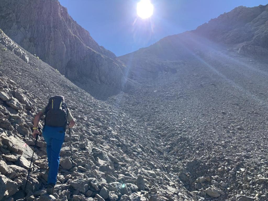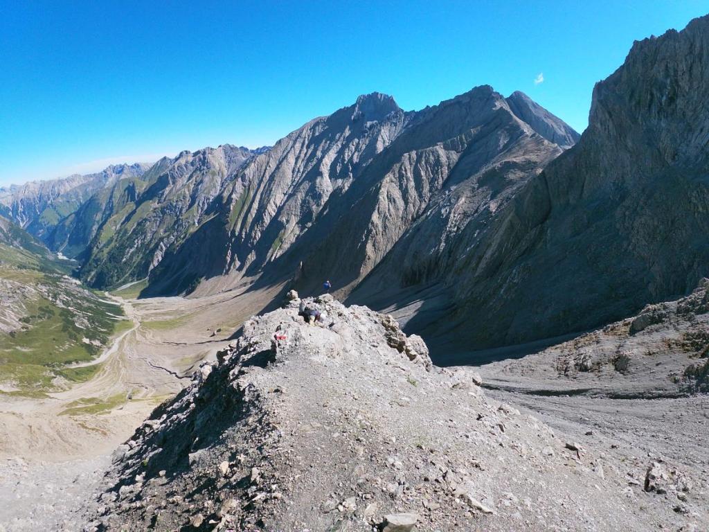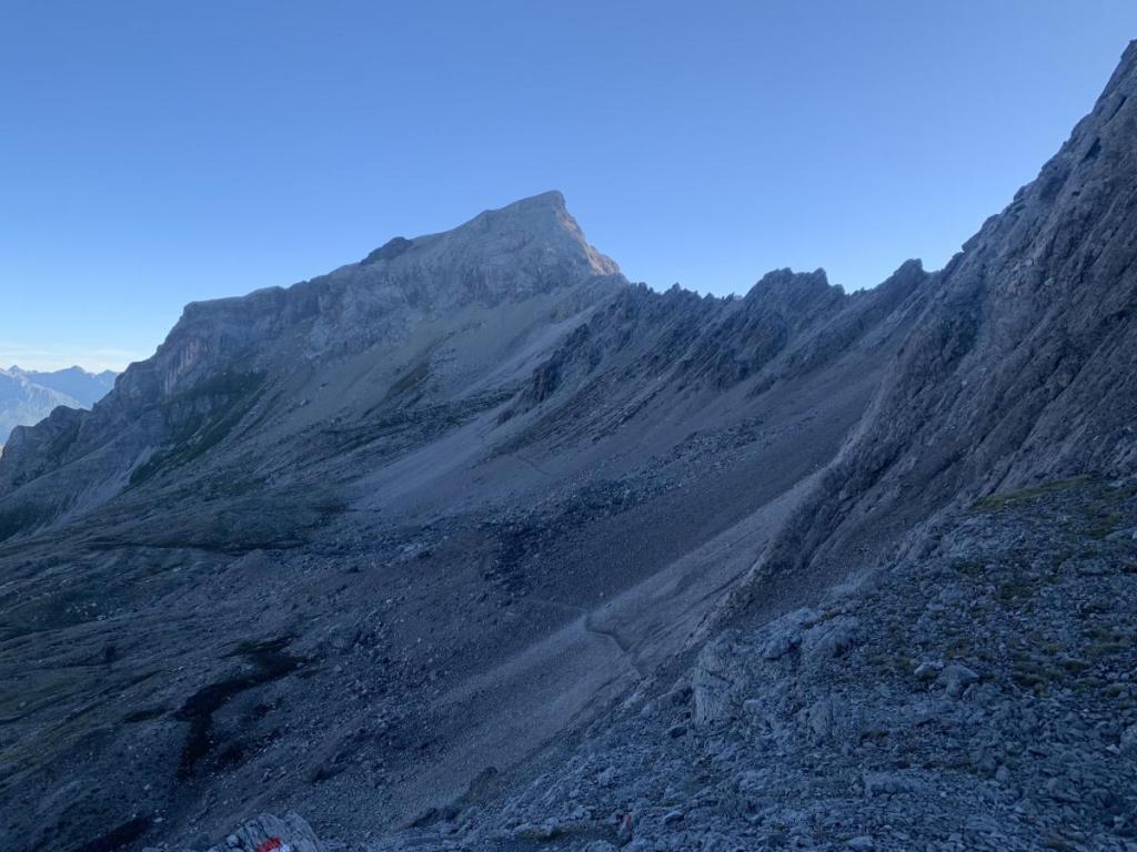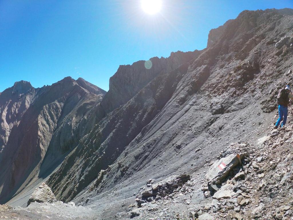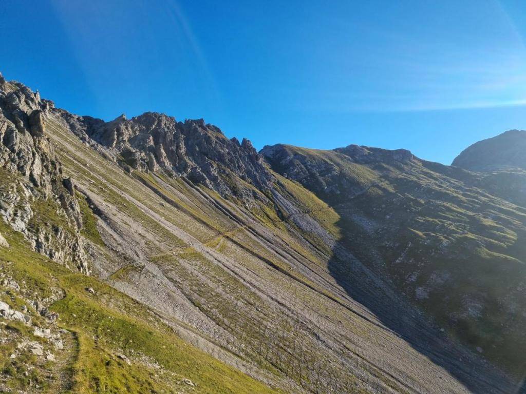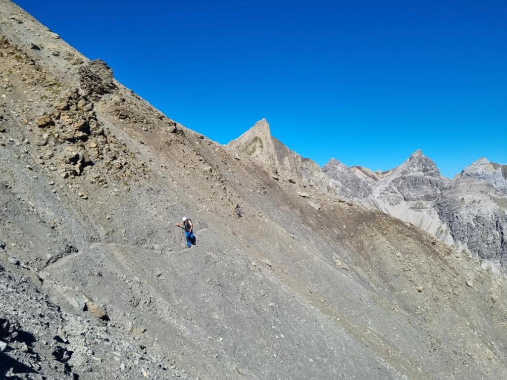 Schließlich müssen wir noch ein paar Höhenmeter aufsteigen und erreichen den Übergang beim Grießmuttekopf, der uns wieder auf die Südseite der Schotterhänge bringt.
