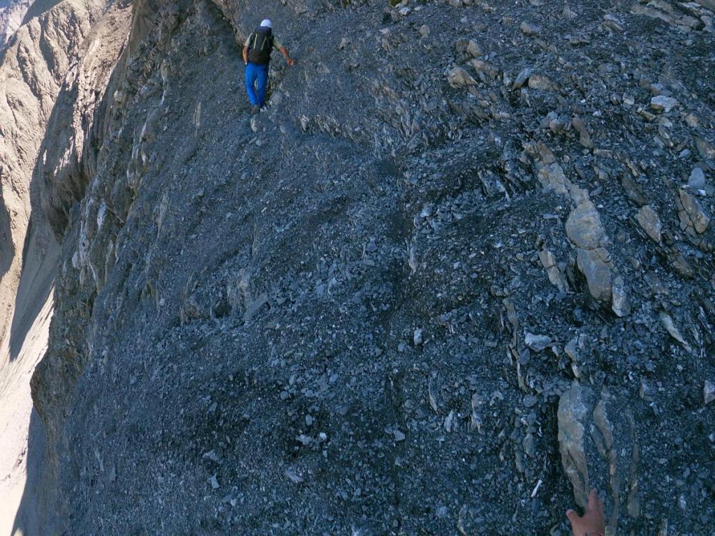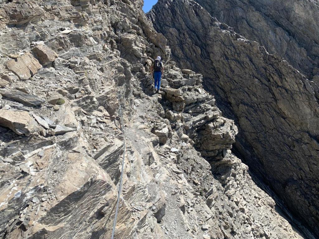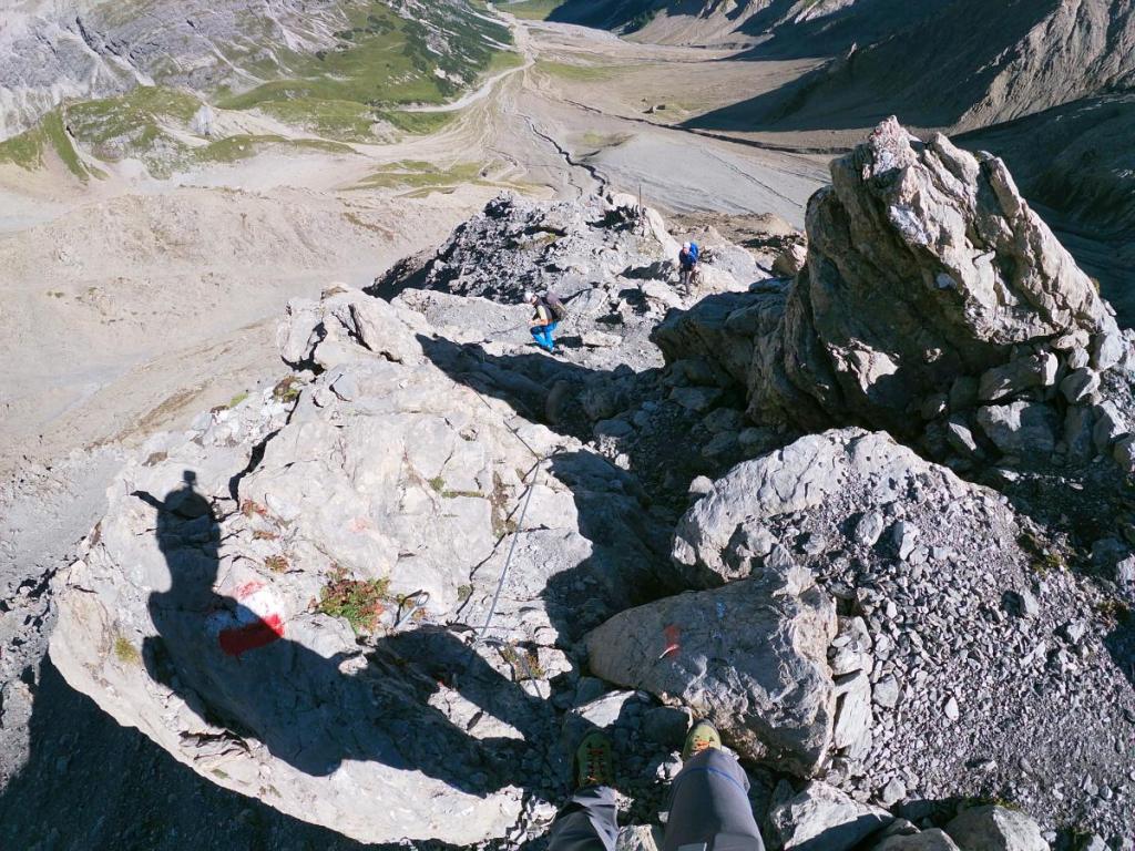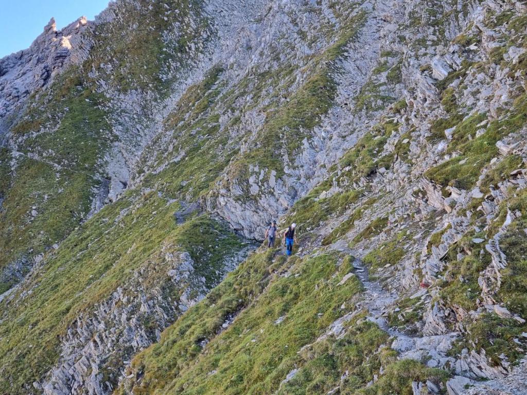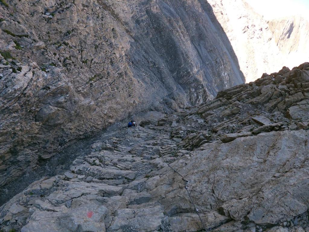 Im Rückblick sieht man, wie ausgesetzt der Weg ist. Ein Fehltritt ist hier keine Option, zu tief wäre der Fall. Eine Versicherung ist in diesem Gelände nicht möglich, eine stabile Verankerung wäre nicht setzbar. Also obliegt es der Trittsicherheit des Bergsteigers allein, hier heil über diese Stelle zu gelangen.
