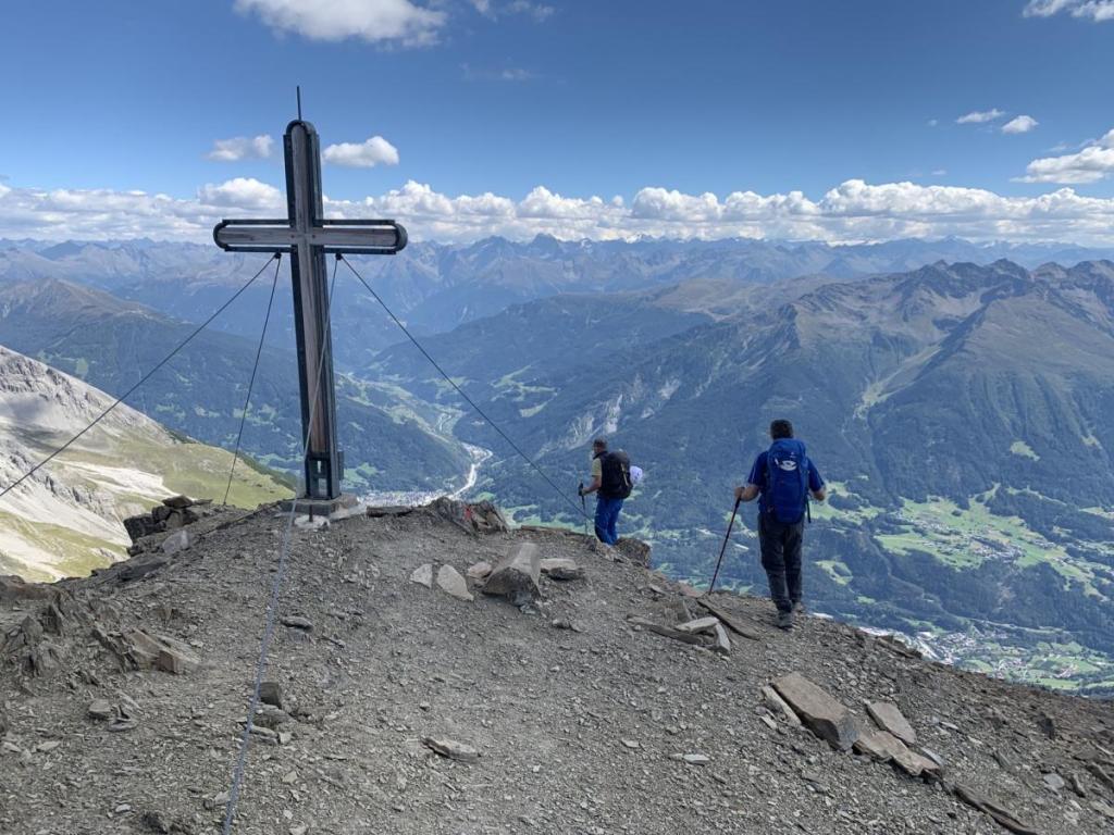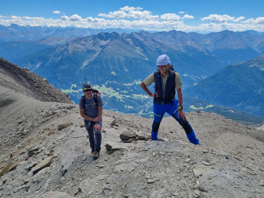 Hubert erzählt uns beiläufig, dass ihn bei seinem Passeierbesteigungsversuch ein Stein durch vorgehende Bergsteiger oder evtl. auch Gämsen nur knapp verfehlt hat. Sein Rucksack wurde allerdings beschädigt…