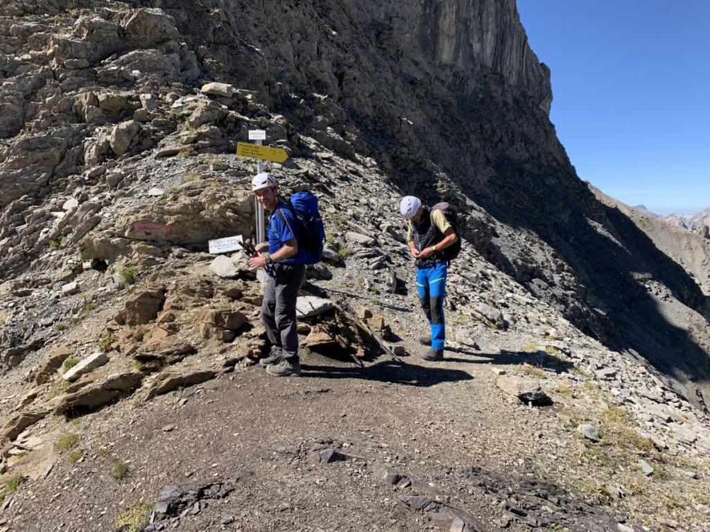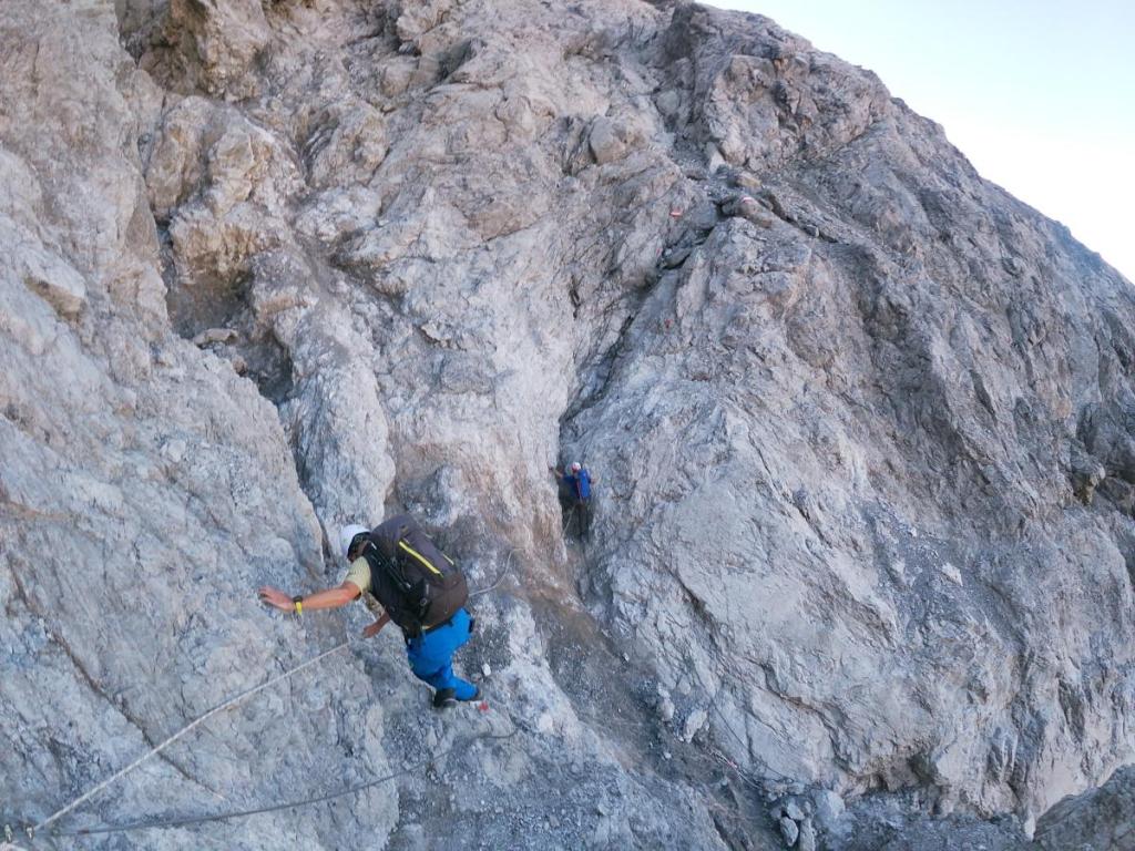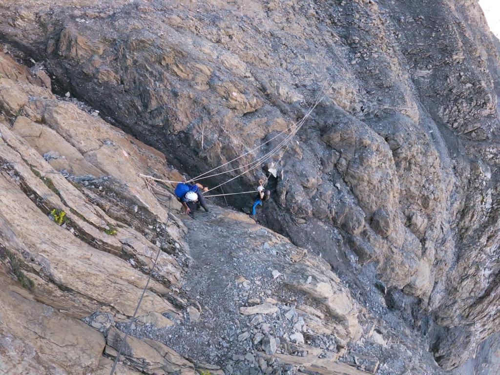Wir erreichen eine berüchtigte Stelle, mit Seilen versichert. Die Eisrinne, hier liegt normalerweise bis in den Spätsommer Schnee, ist heute komplett trocken und dank Versicherungen gut zu begehen.