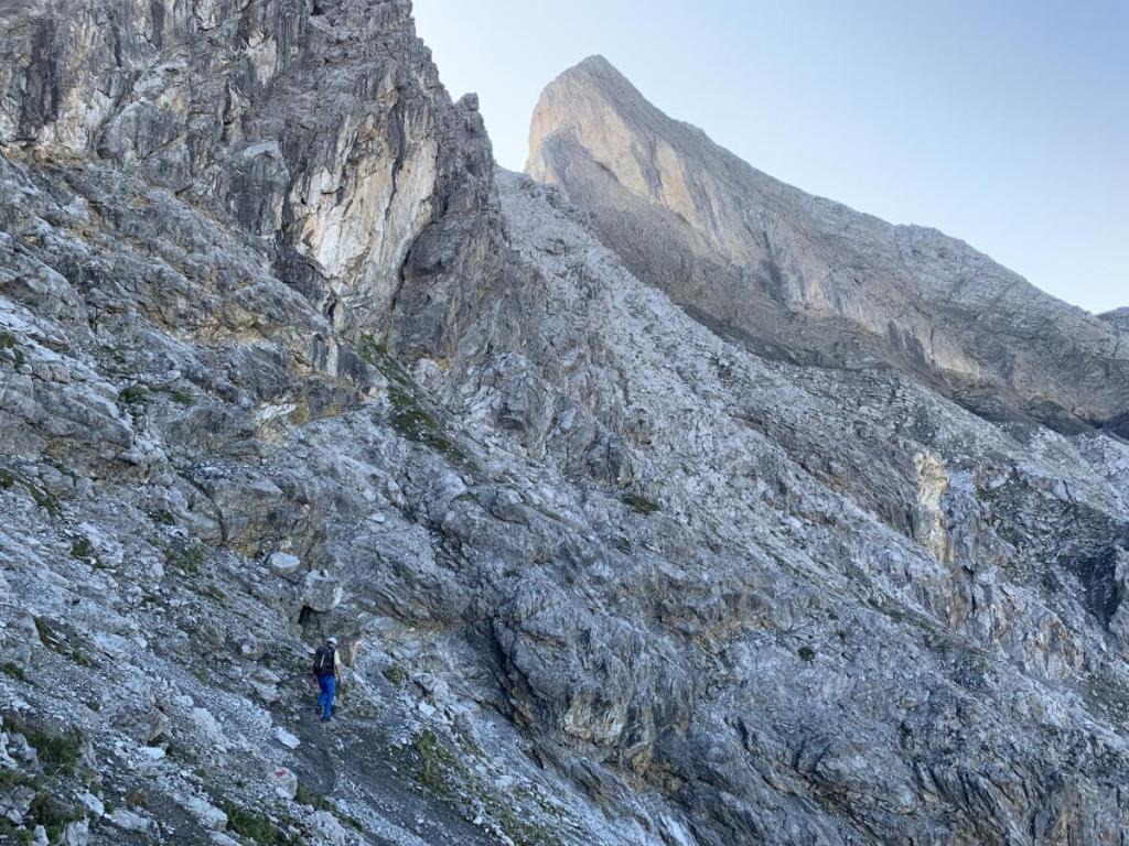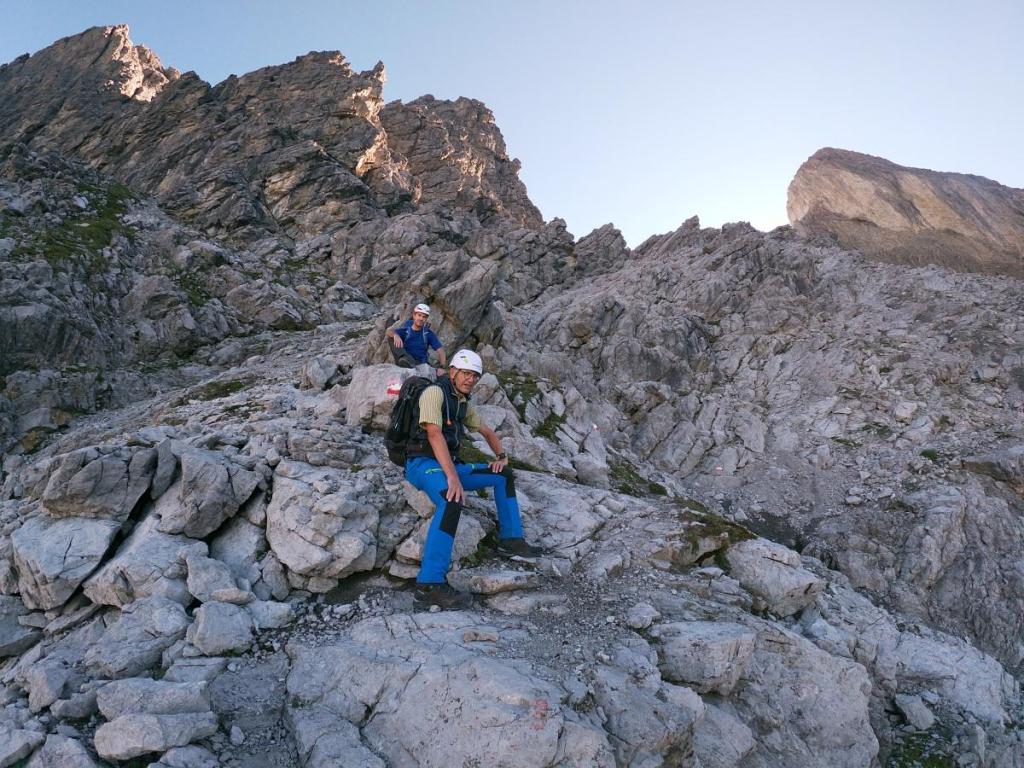Hier beginnt nun der Weg ins Gelbe Schartl. Steil, ausgesetzt und moralisch anspruchsvoll. Dank der Sektion Augsburg ist der Weg aber sehr gut in Schuss. An dieser Stelle ein großes Kompliment an die Wegebauer der Sektion DAV Augsburg!