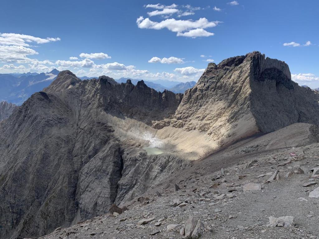 Ein Blick nach Norden erlaubt uns die kläglichen Reste des einst mächtigen Parsseier Ferners zu betrachten. Nur noch kleine Reste, die die nächsten Jahre wohl nicht mehr überstehen werden, sind zu sehen.