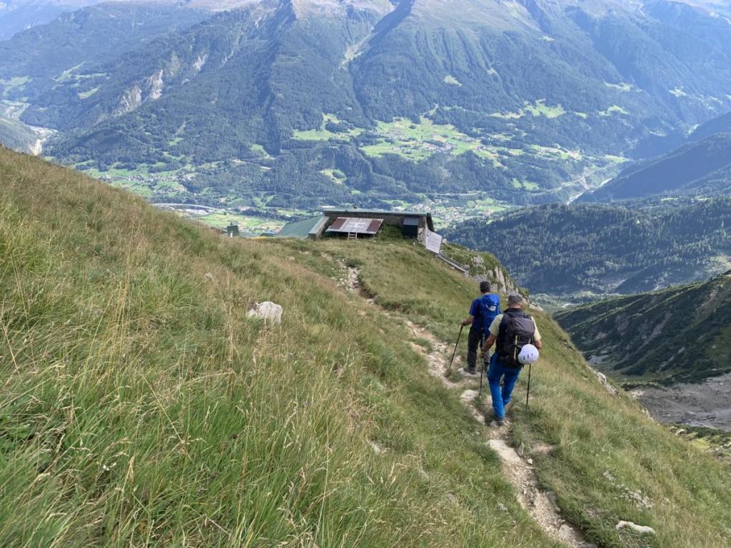 Es müssen hier ein paar Meter ab- und dann wieder aufgestiegen werden. Wir haben sicherheitshalber Grödel mitgenommen, aber die scheinen dieses Mal nicht notwendig zu sein.