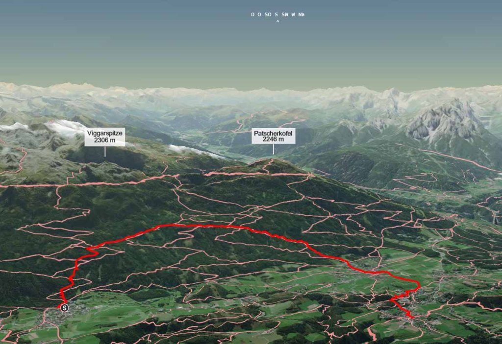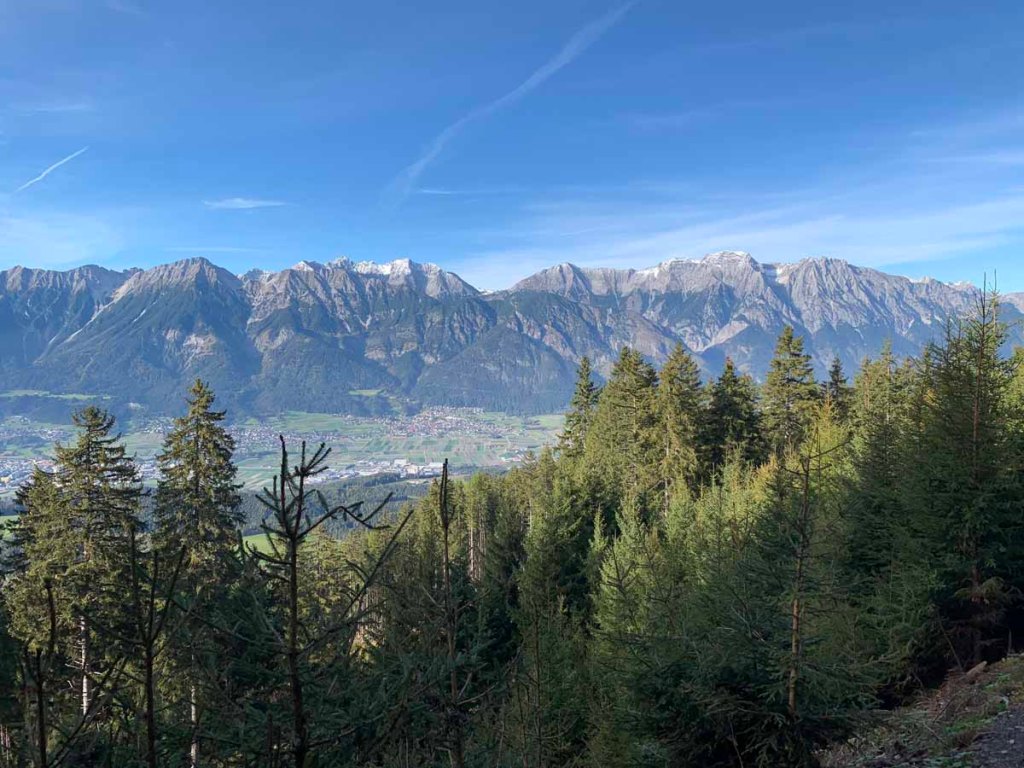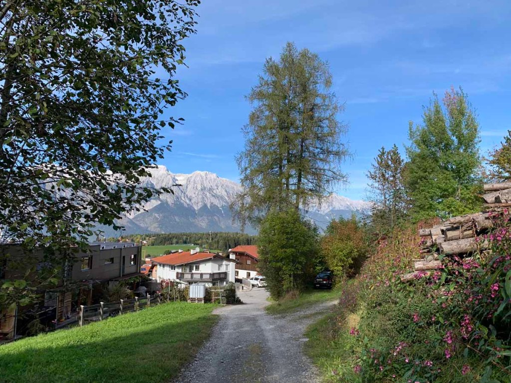 Durch den schönen Ort wandere ich gen Norden, ein Blick über die Schulter lässt mich den Patscherkofel erblicken.