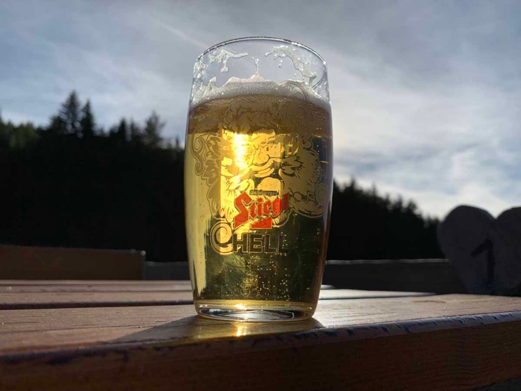 Nach 45min. erreiche ich die Rinner Alm (1.380 m), die Sonne bestreicht noch die Terasse, es sitzen ein paar Arbeiter bei einem Feierabendbier… es scheint eine lustige Gruppe zu sein.
