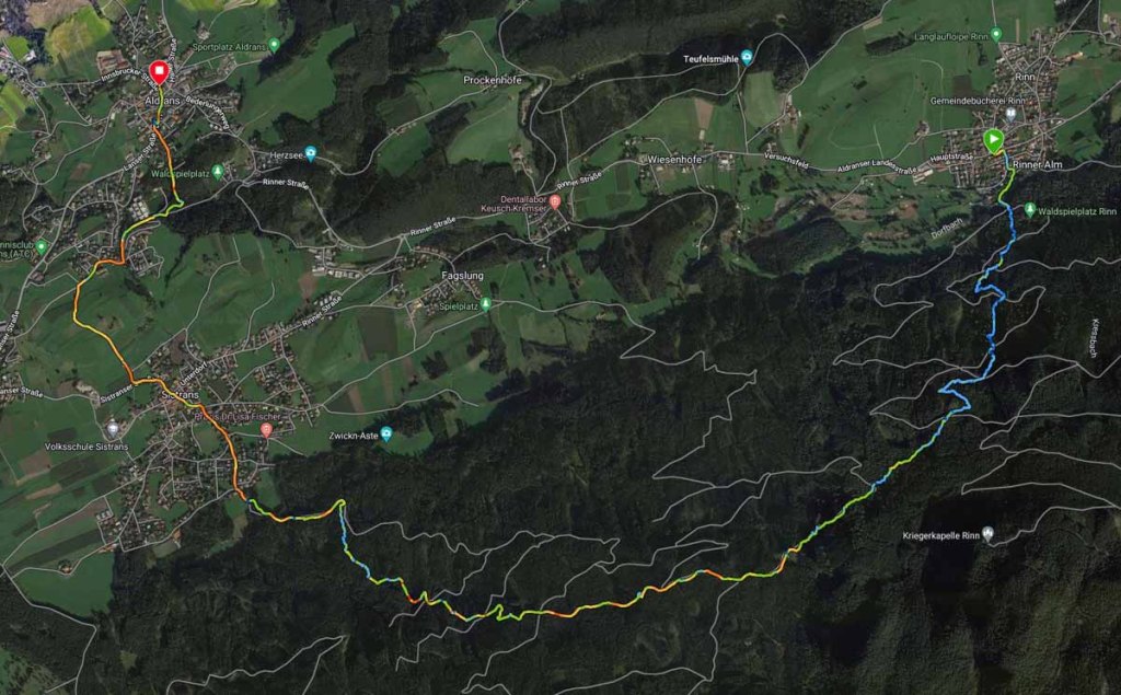 Start, wie so oft, ist der Kirchplatz in Rinn, den ich mit dem Bus erreiche. Ein paar Meter höher erreiche ich den Wanderparkplatz und auch den Beginn des Aufstiegs.