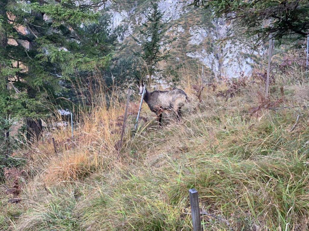 Gedankenverloren bleibe ich einmal kurz stehen, sehe aus dem Augenwinkel etwas. Ich drehe meinen Kopf, keine 3 Meter von mir stehe eine Gämse. Ich schaue genau, kann aber keine Bewegung ausmachen… was ist los mit dem Tier. Ich gehe ein paar Schritte und sehe wie sich der Kopf der Gämse dreht. Also doch nicht ausgestopft…