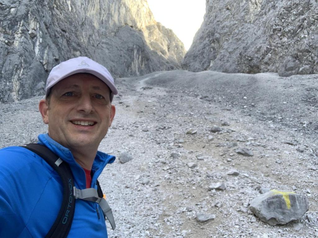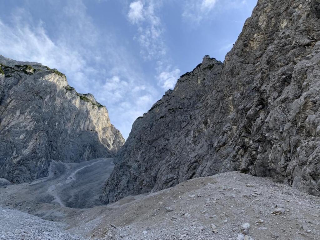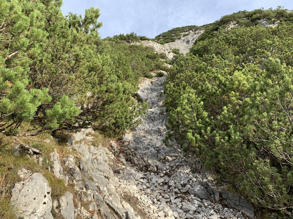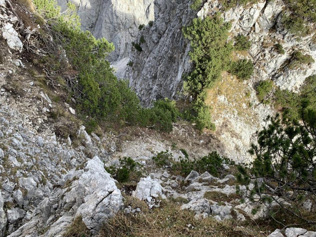 Eine steile Steinrinne, zum Glück frei von Gämsen, tut sich vor mir auf. Gerne bringe ich dieses Hindernis rasch hinter mich…