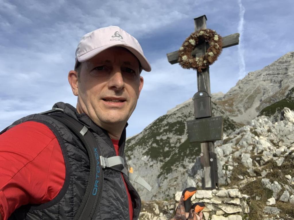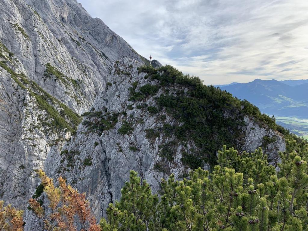 Erst kurz vor dem Erreichen der Hüttenspitze offenbart sich mir das kleine Kreuz. Ein paar Meter muss ich noch absteigen, damit ich schließlich zum Gipfel steigen kann.