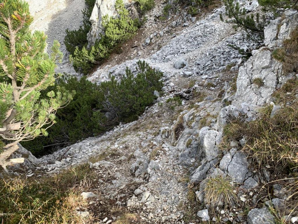 … bald darauf quert der Weg einen schotterigen Hang, auch hier, wie fast überall am Weg heute, beobachten mich zwei Gämsen. Ich komme mir schon fast wie bei Hitchcock vor. Und wie von mir befürchtet, alsbald flüchten die scheuen Tiere und ein Steinhagel ergießt sich in die oben genannte Schlucht.