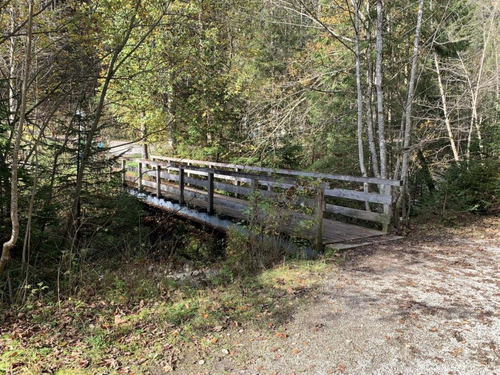 Da ich bei der Walderkapelle parke, geht es für mich über eine Brücke üben den Weißenbach, dann spaziere ich auf breiter Straße zum Parkplatz.