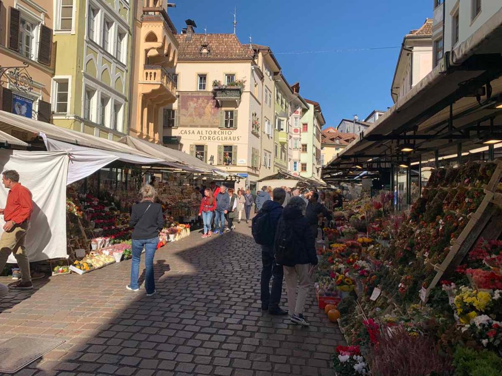 An der Talfer entlang erreichen wir wieder die Altstadt, hier machen wir noch einen Zwischenstopp am Obstmarkt und kaufen würzigen Käse ein und genießen ein Getränk in der Herbstsonne.