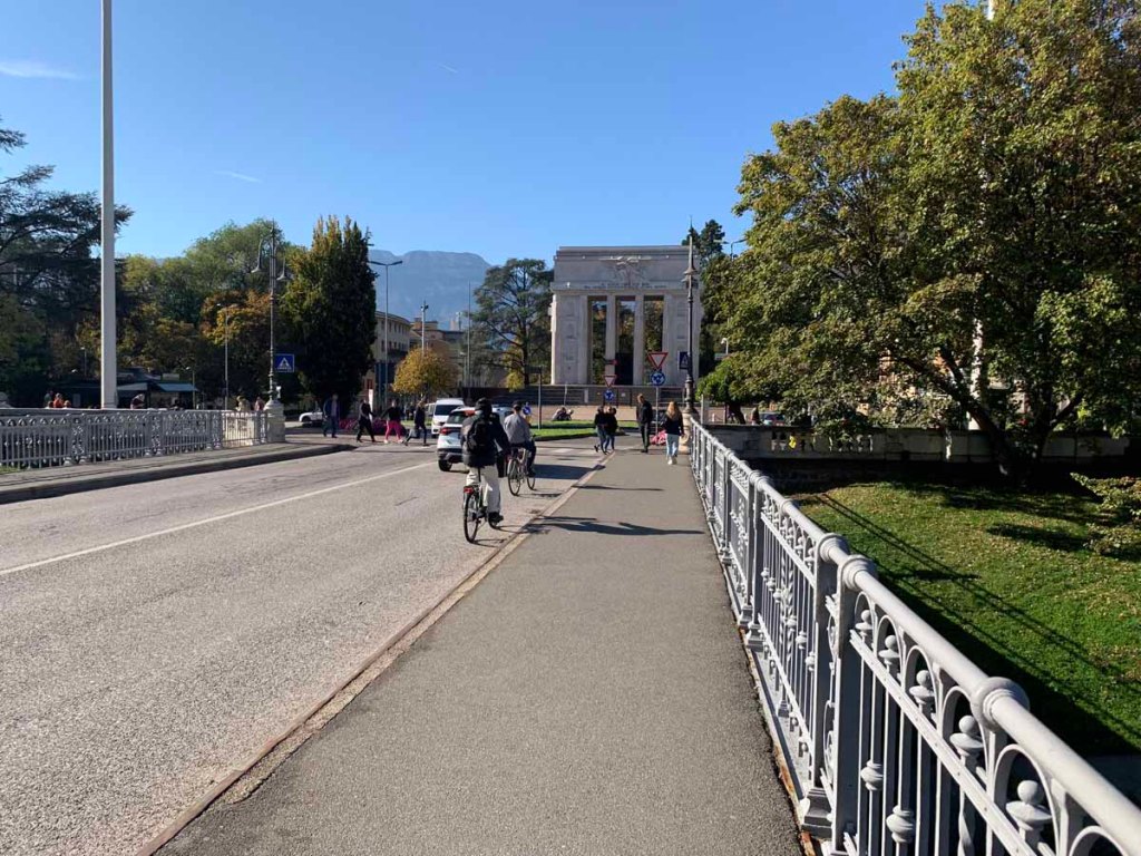 Über die Talferbrücke sehen wir das Siegesdenkmal aus der Faschistenzeit, das den Übergang vom alten, deutschen zum neuer, italienischen Teil von Bozen markiert.