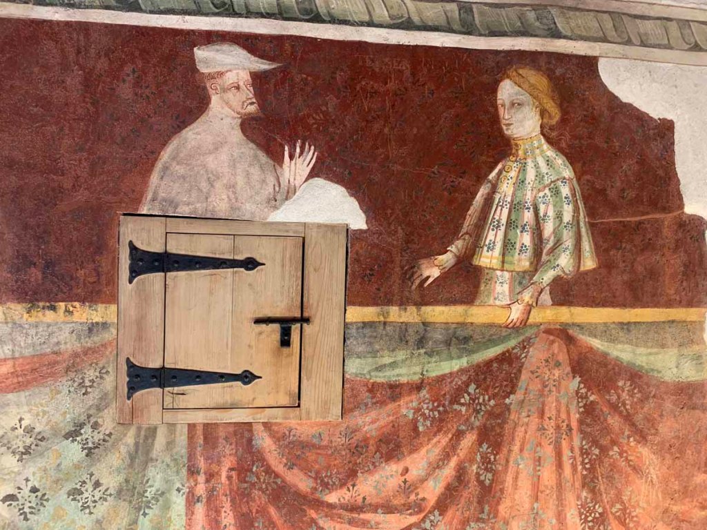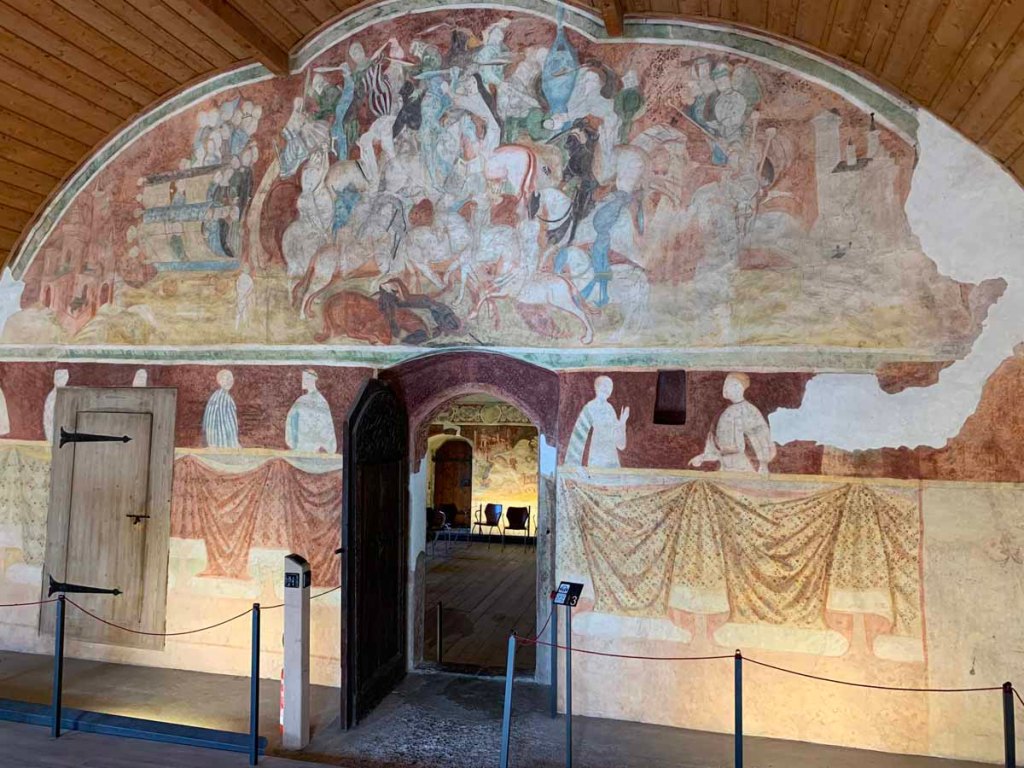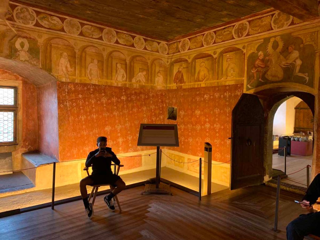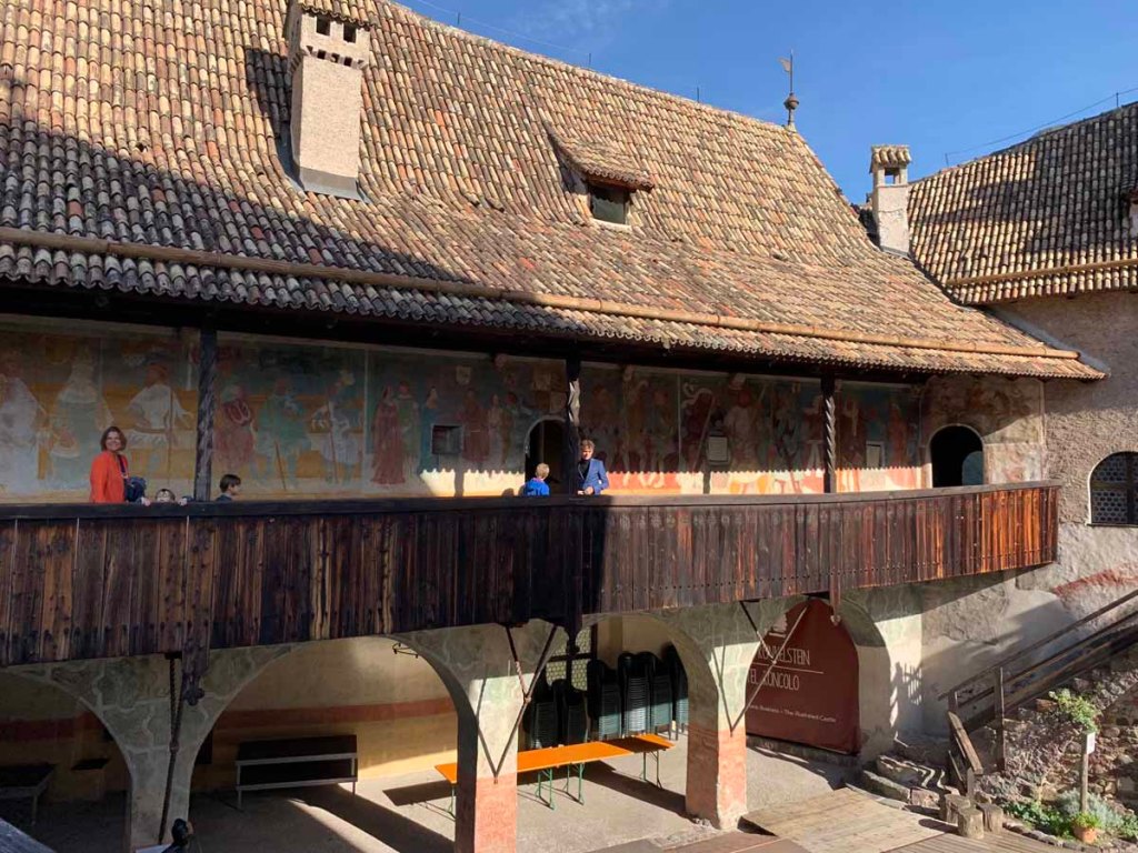 Nach gut 45 Minuten erreichen wir die für ihre Fresken bekannte Burg. Ein kurzer, steiler Aufstieg bringt uns zum Schloss, das auf einem Porphyrfelsen thront.