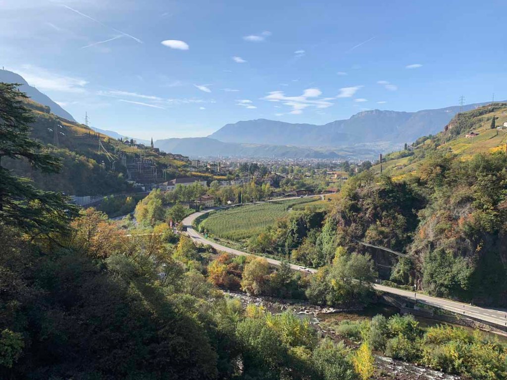 Der Ausblick von den Wehrgängen nach Süden zeigt wieder die liebliche Landschaft um Bozen, mit den für Herbst so typischen Farben.
